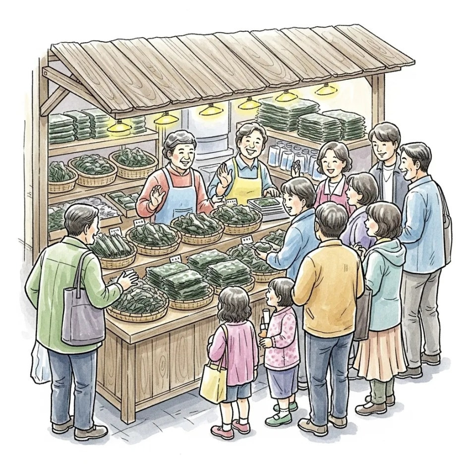 이 김은 시장에서 오랫동안 자리를 지켜온 전통 있는 제품으로, 자연산 돌김을 얇게 구워 기름과 소금을 살짝 입힌 것이 특징이라고 해요.