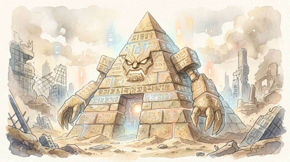 피라미디몬은 디지털 월드 곳곳에 흩어진 고대 유적의 데이터를 모아 진화하는 광물형 디지몬이라고 해요.