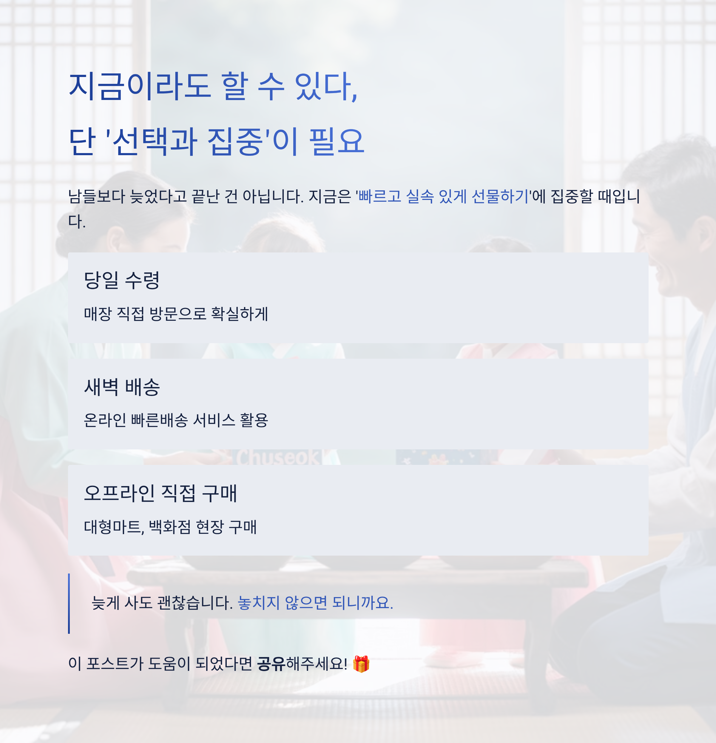 - 지금은 ‘빠르고 실속 있게 선물하기’에 집중할 때입니다.