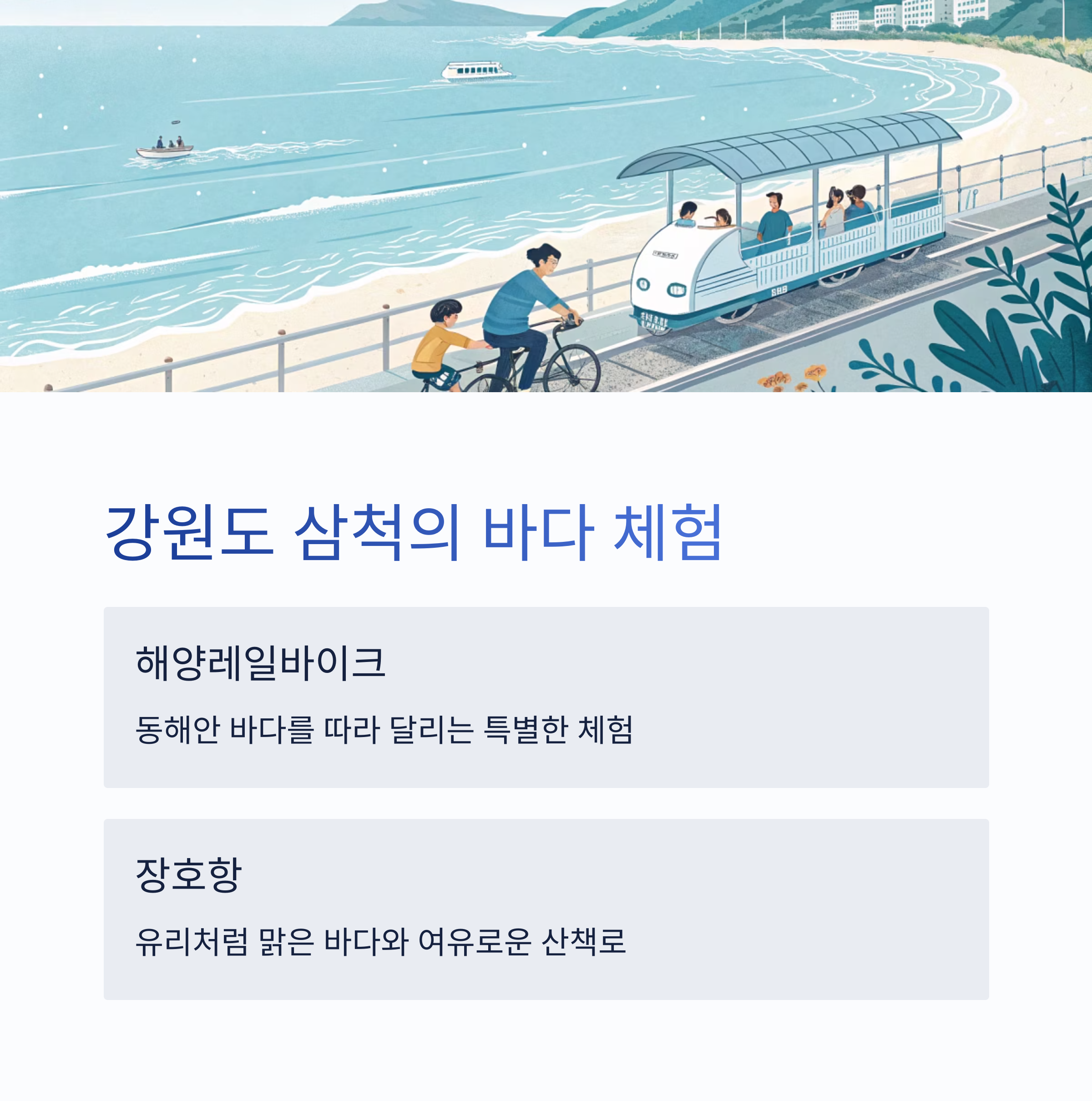 | 강원 삼척 | 해양레일바이크 & 장호항 | 바다 체험, 레일 자전거, 산책 | 매우 높음 |