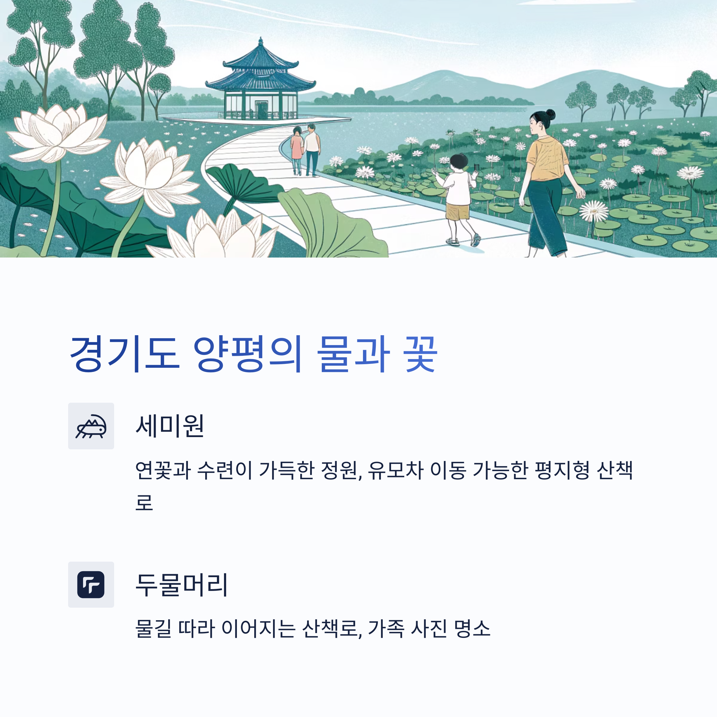 | 경기 양평 | 세미원 & 두물머리 | 연꽃 정원, 유모차 가능 산책로 | 매우 높음 |