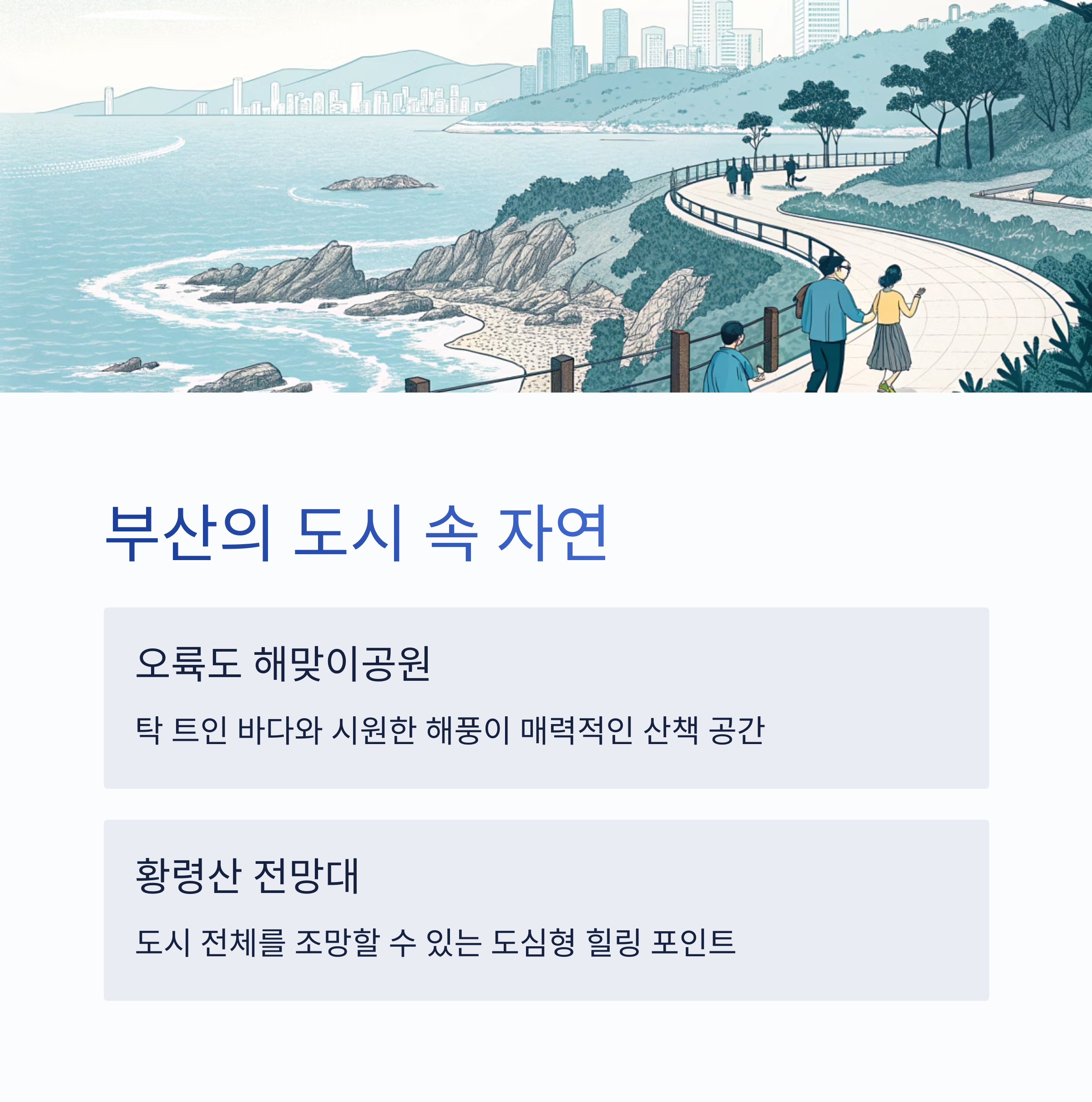 | 부산 | 오륙도공원 & 황령산 전망대 | 바다 산책, 도시 전망, 근거리 이동 용이 | 높음 |