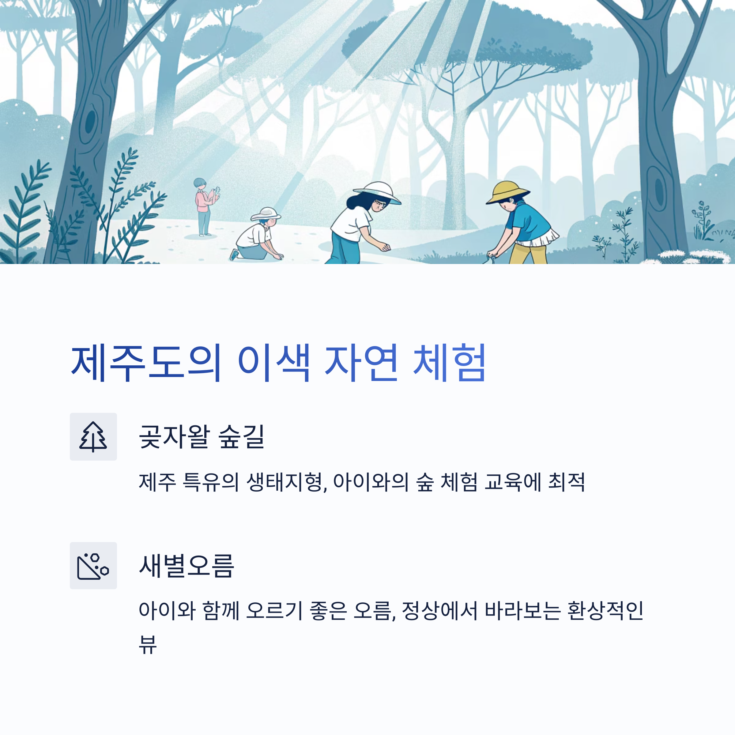 | 제주도 | 곶자왈 숲길 & 새별오름 | 생태 체험, 자연 걷기, 포토 스팟 | 매우 높음 |