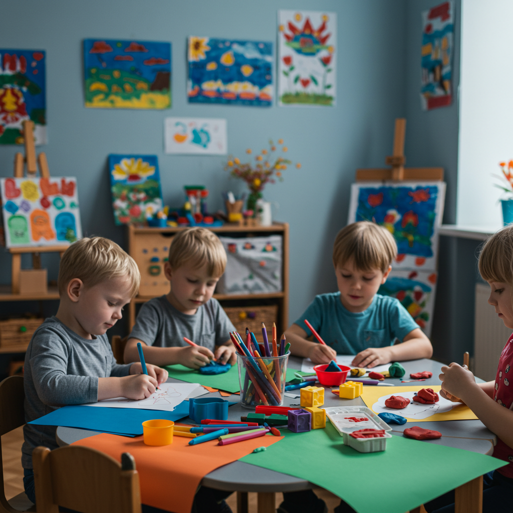 - 창의성과 표현력 증진: 자유로운 그림 그리기, 색종이 오리고 붙이기, 점토로 동물/사물 만들기, 재활용품으로 작품 만들기