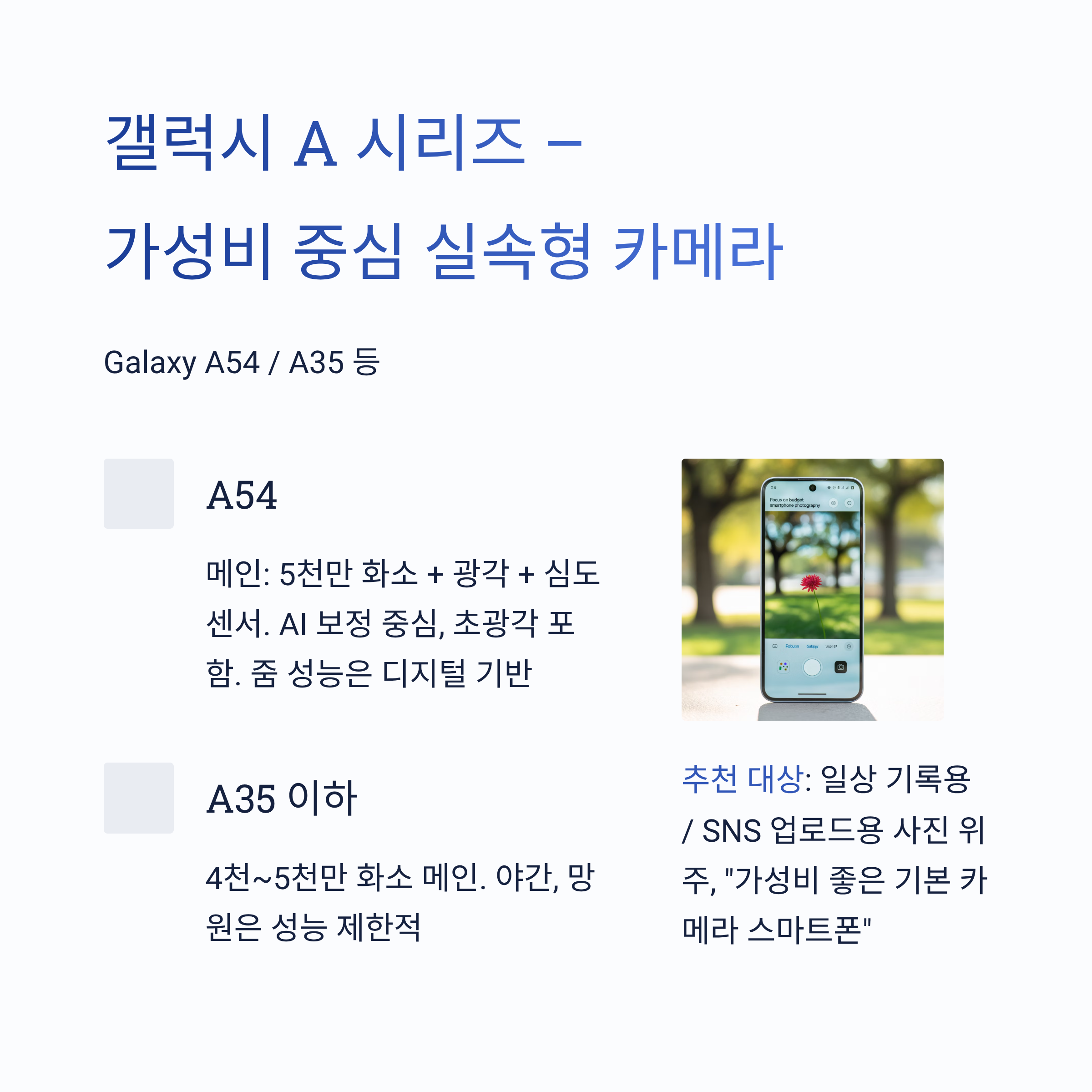 🥉 갤럭시 A 시리즈 – 가성비 중심 실속형 카메라