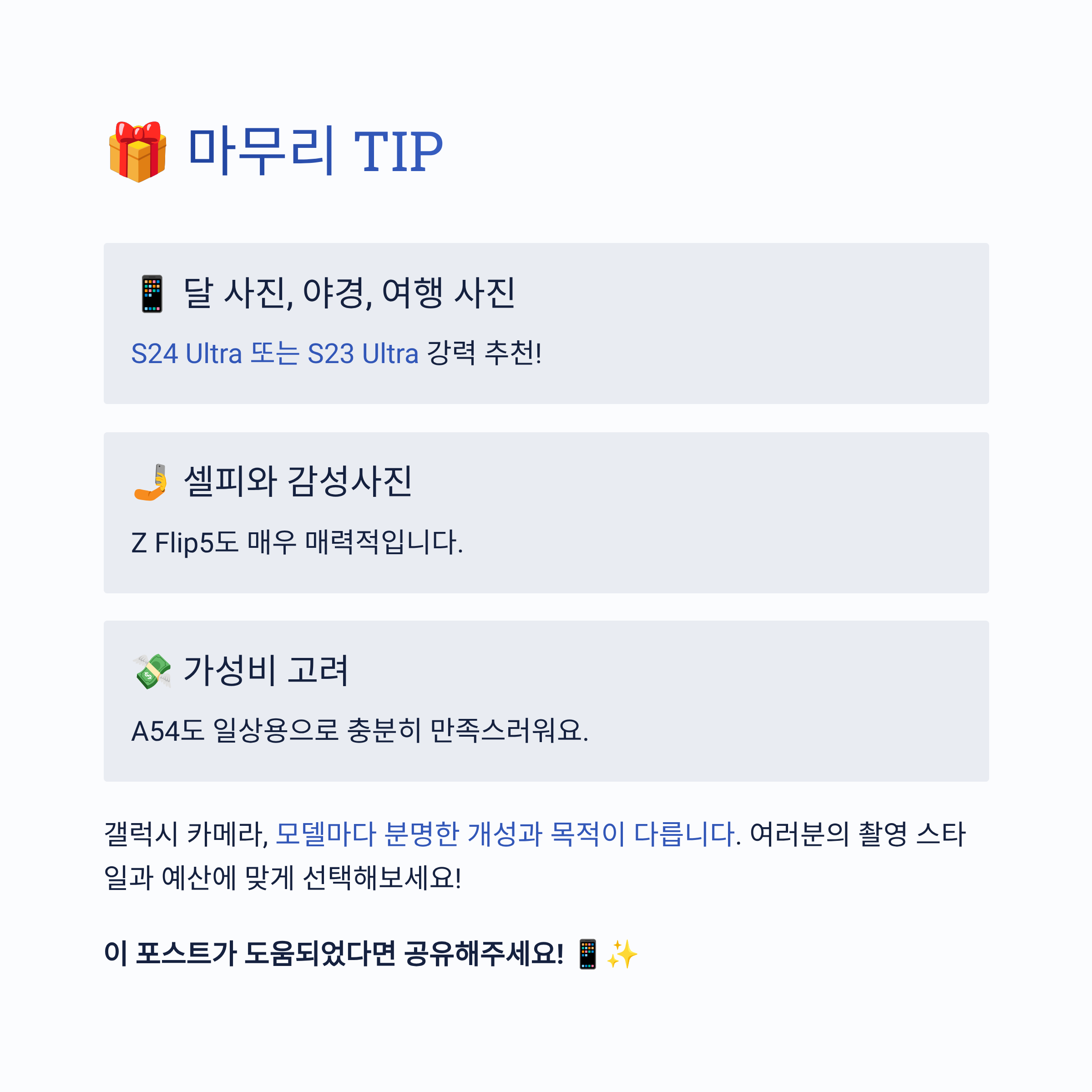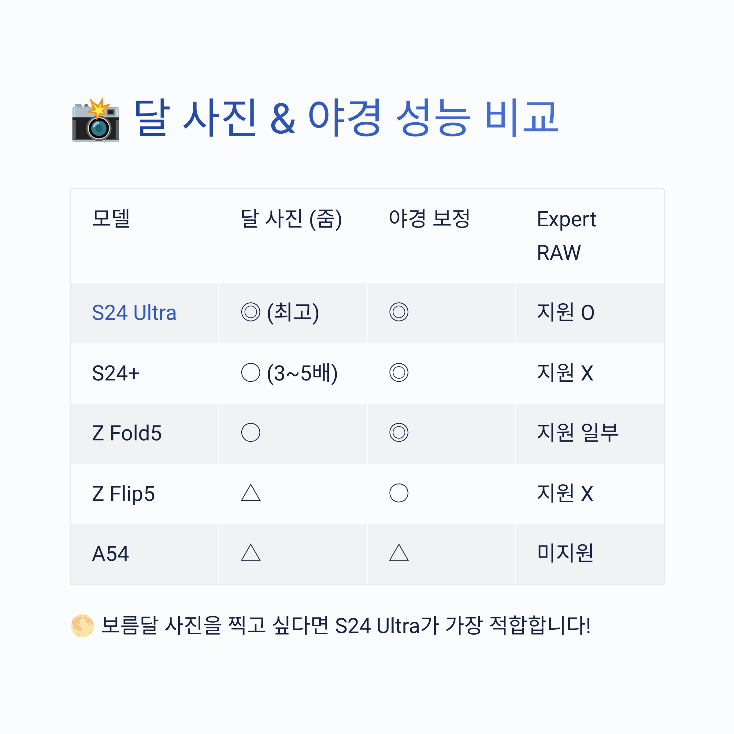 - 📱 달 사진, 야경, 여행 사진이 중요하다면 S24 Ultra 또는 S23 Ultra 강력 추천!