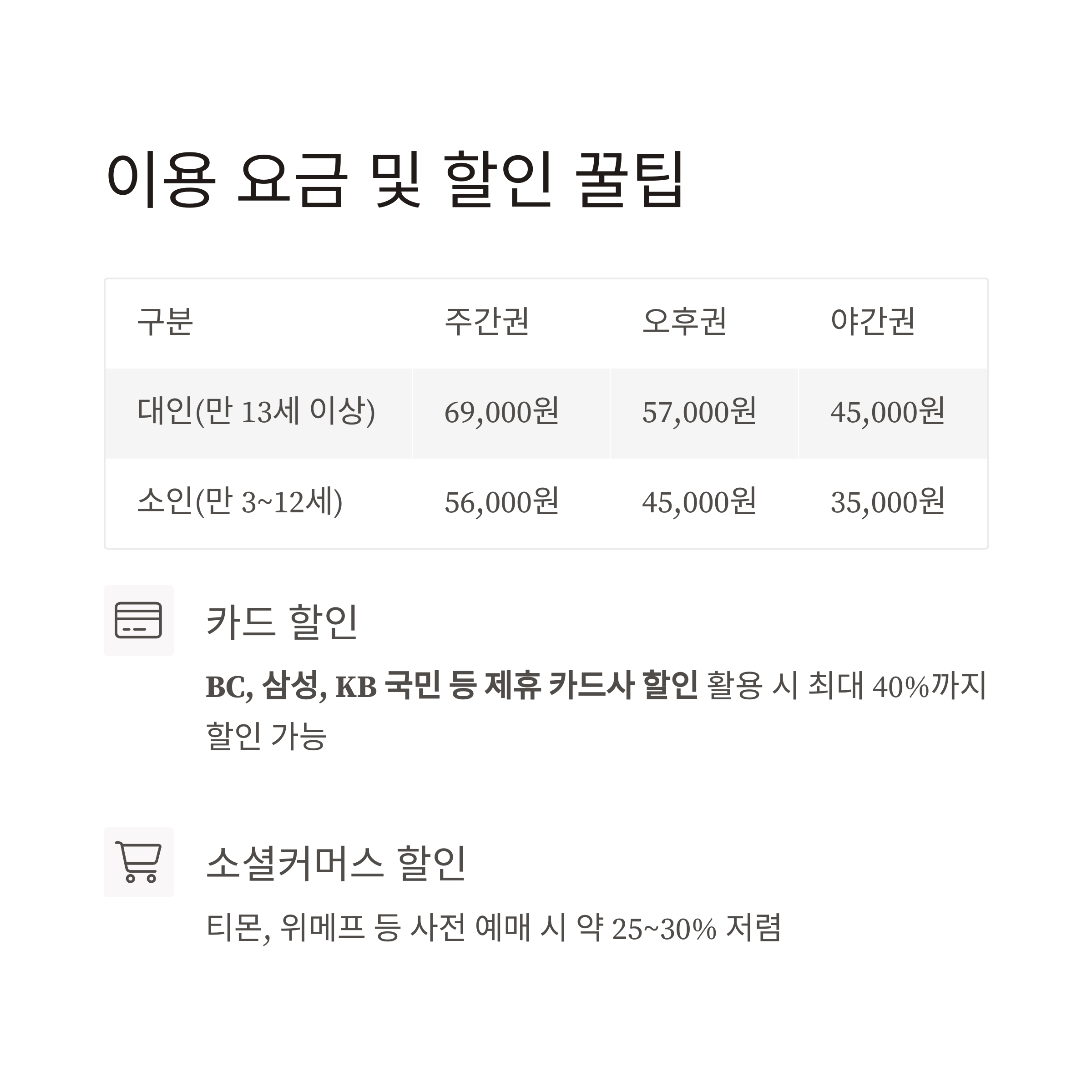 - BC, 삼성, KB 국민 등 제휴 카드사 할인 활용 시 최대 40%까지 할인 가능