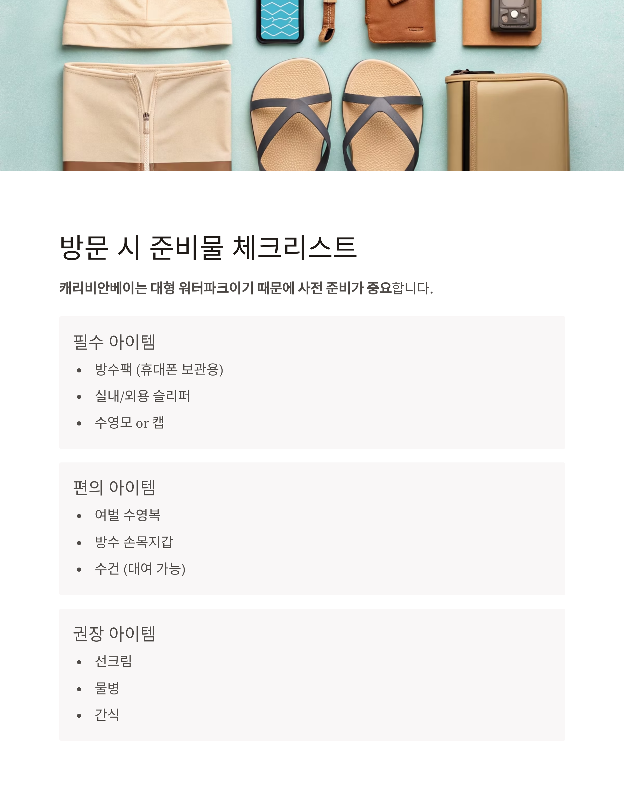 | 실내/외용 슬리퍼 | 위생 및 미끄럼 방지 | 워터파크 전용 신발 권장 |