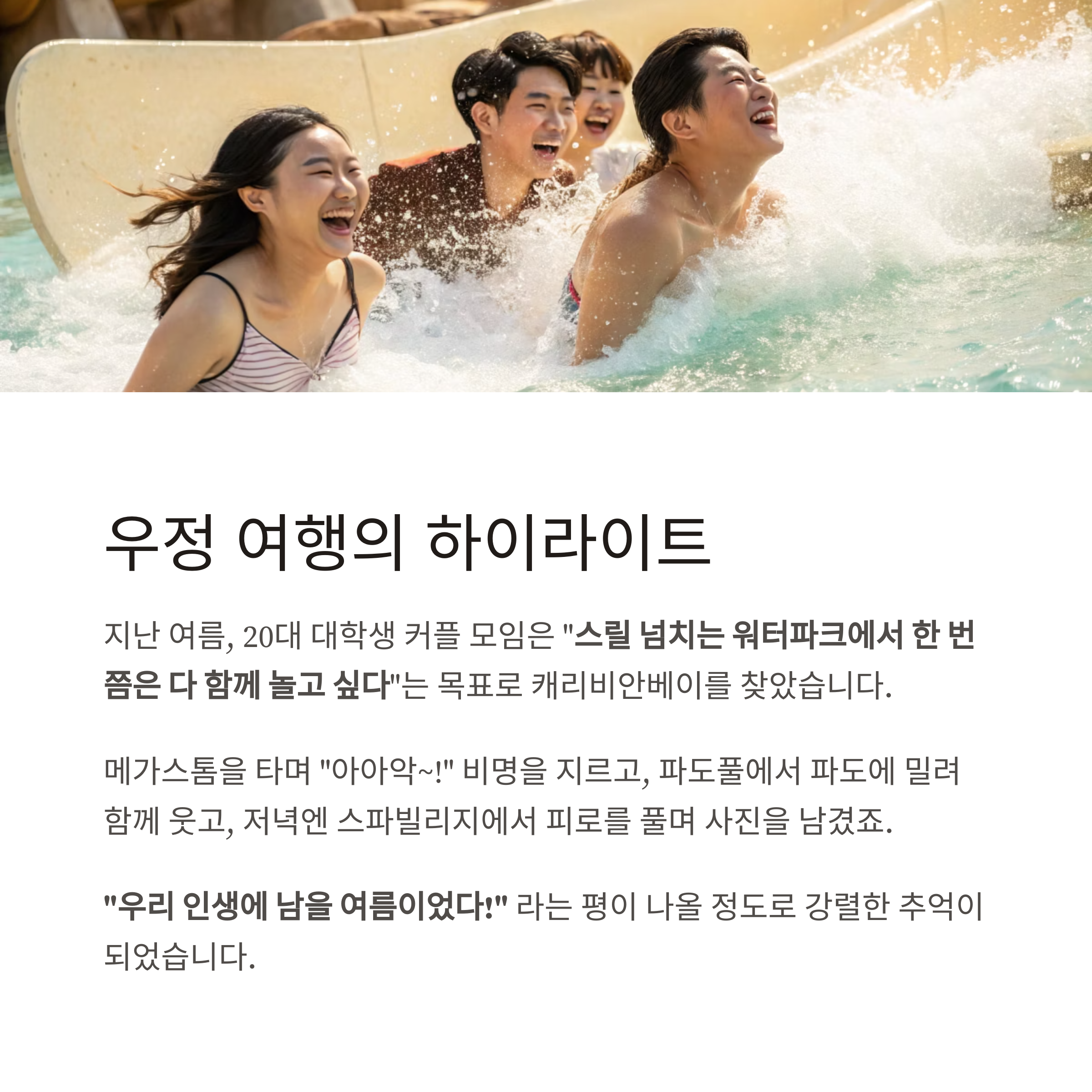 “스릴 넘치는 워터파크에서 한 번쯤은 다 함께 놀고 싶다”는 목표로 캐리비안베이를 찾았습니다.