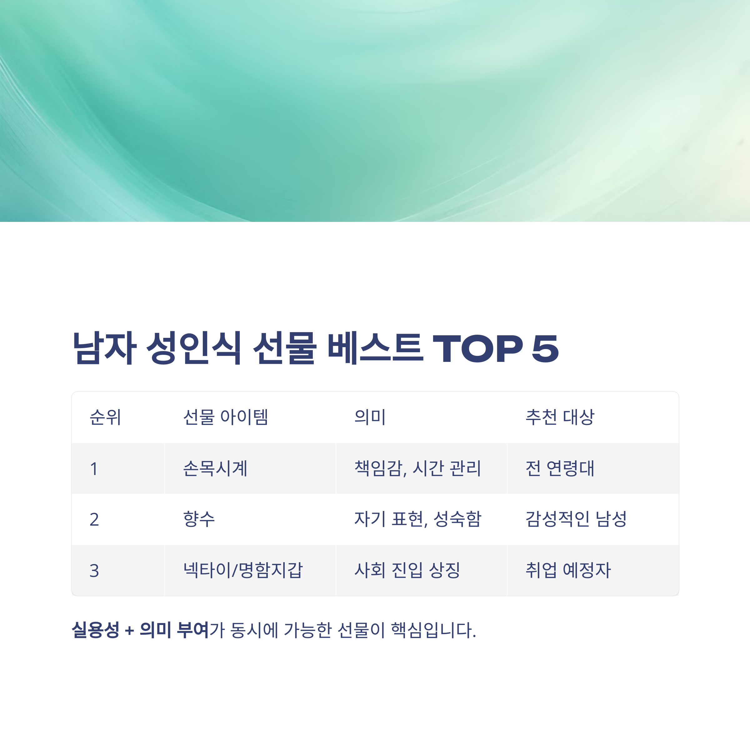 | 3 | 넥타이/명함지갑 | 사회 진입 상징 | 대학 진학/취업 예정자 |