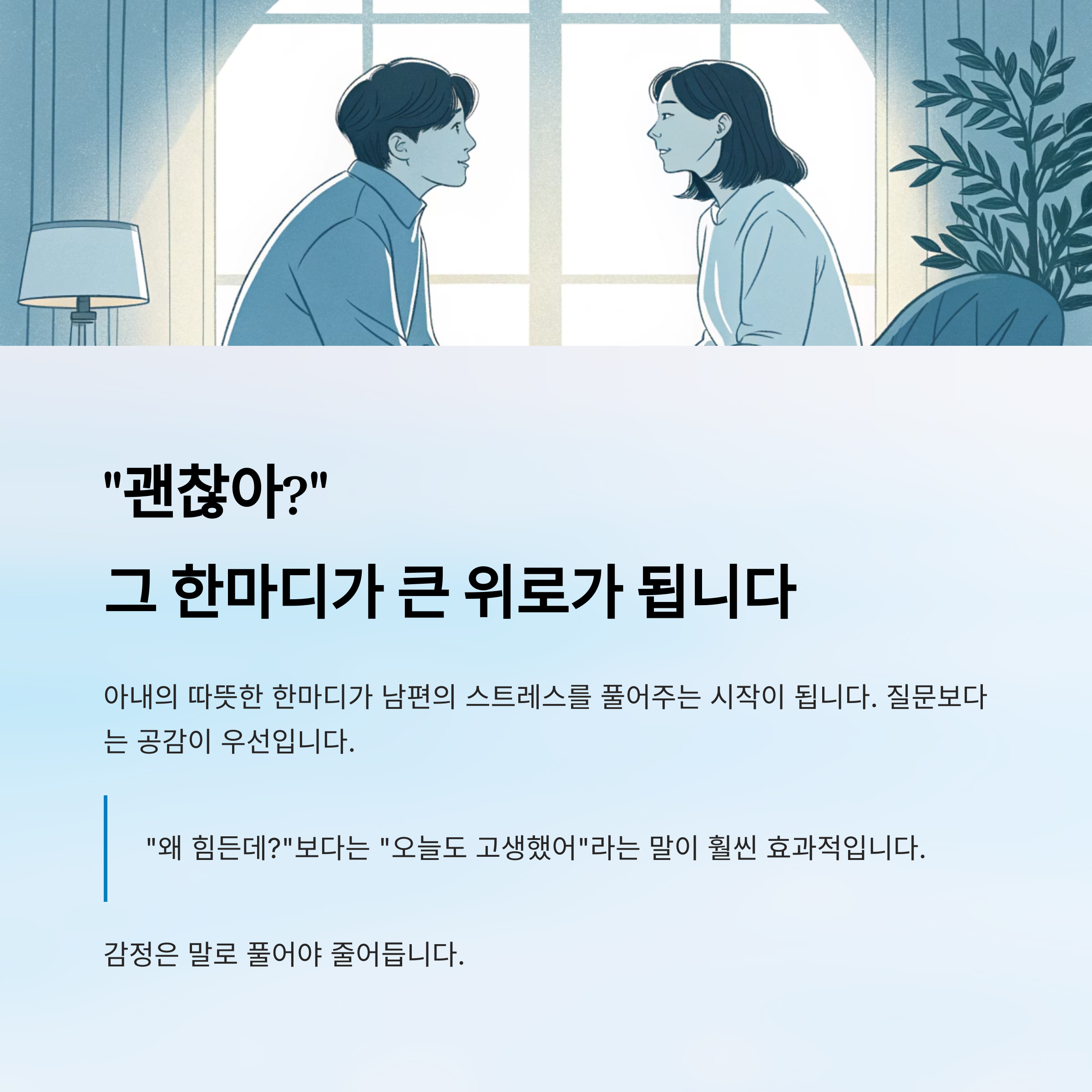 아내의 따뜻한 한마디가 남편의 스트레스를 풀어주는 시작이 됩니다.