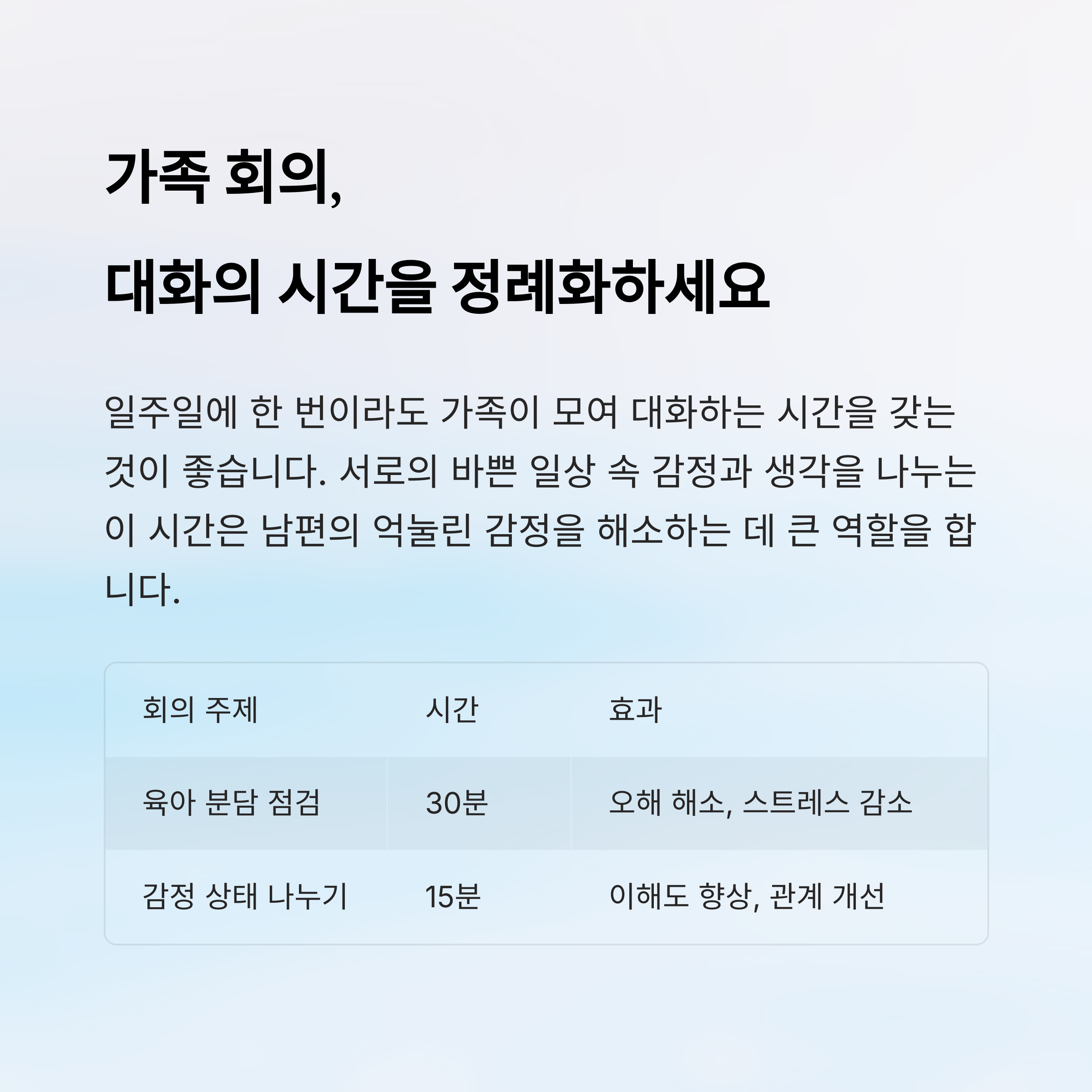 | 육아 분담 점검 | 30분 | 오해 해소, 스트레스 감소 |