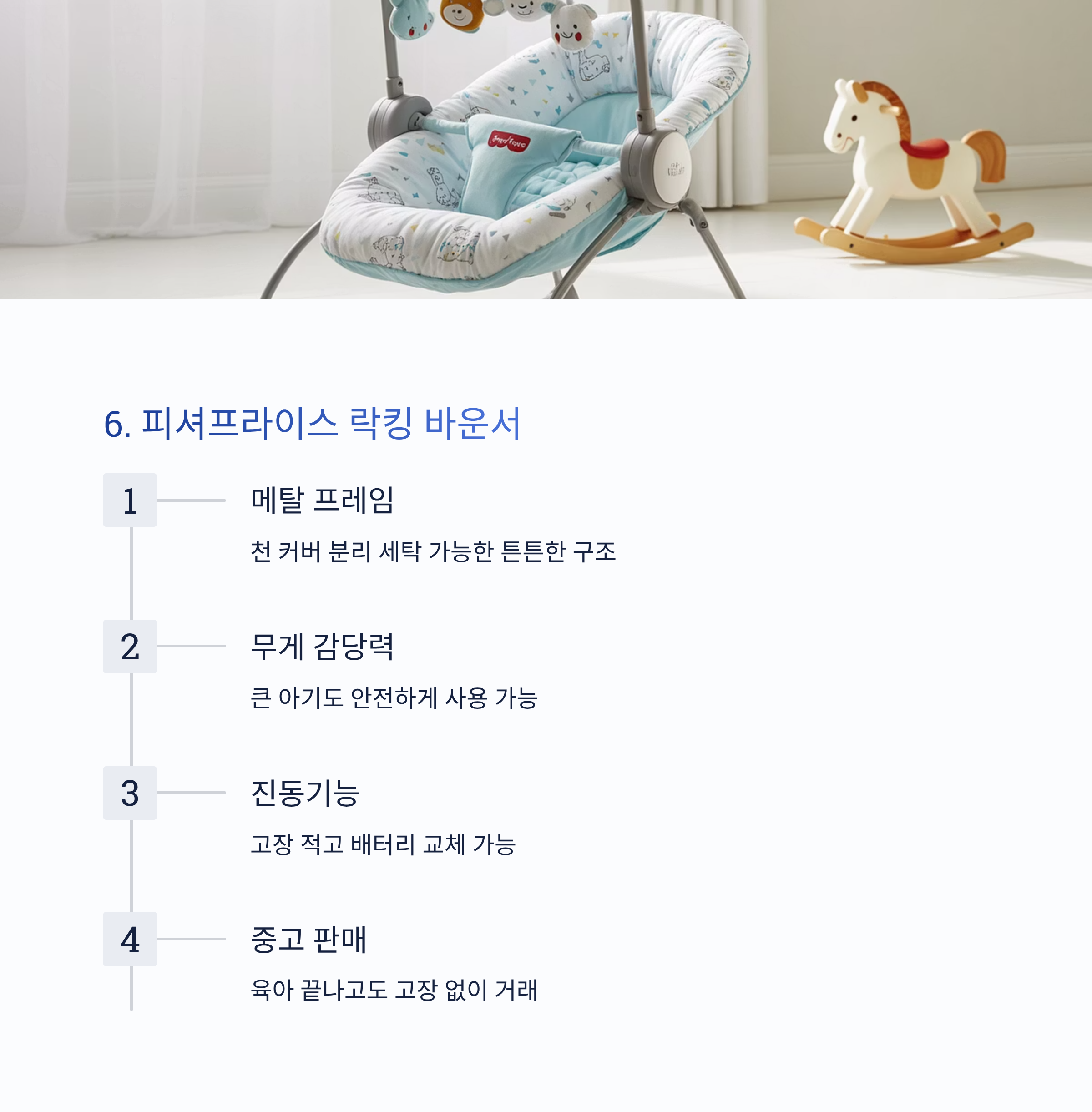 | 바운서 | 프레임 강도, 커버 세탁 가능 | 생후 0~12개월 |