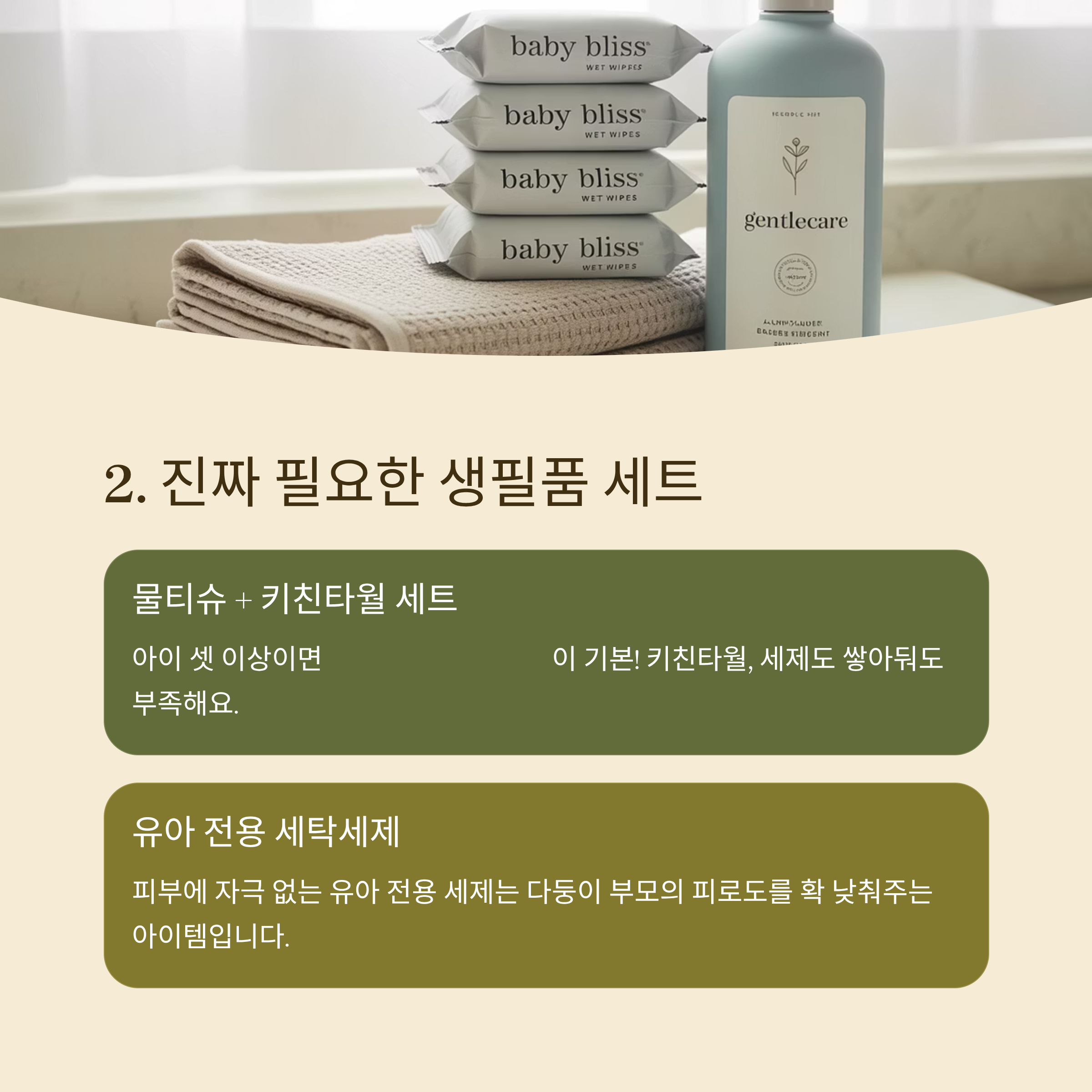| 생필품 | 물티슈, 키친타월, 유아 세제 |