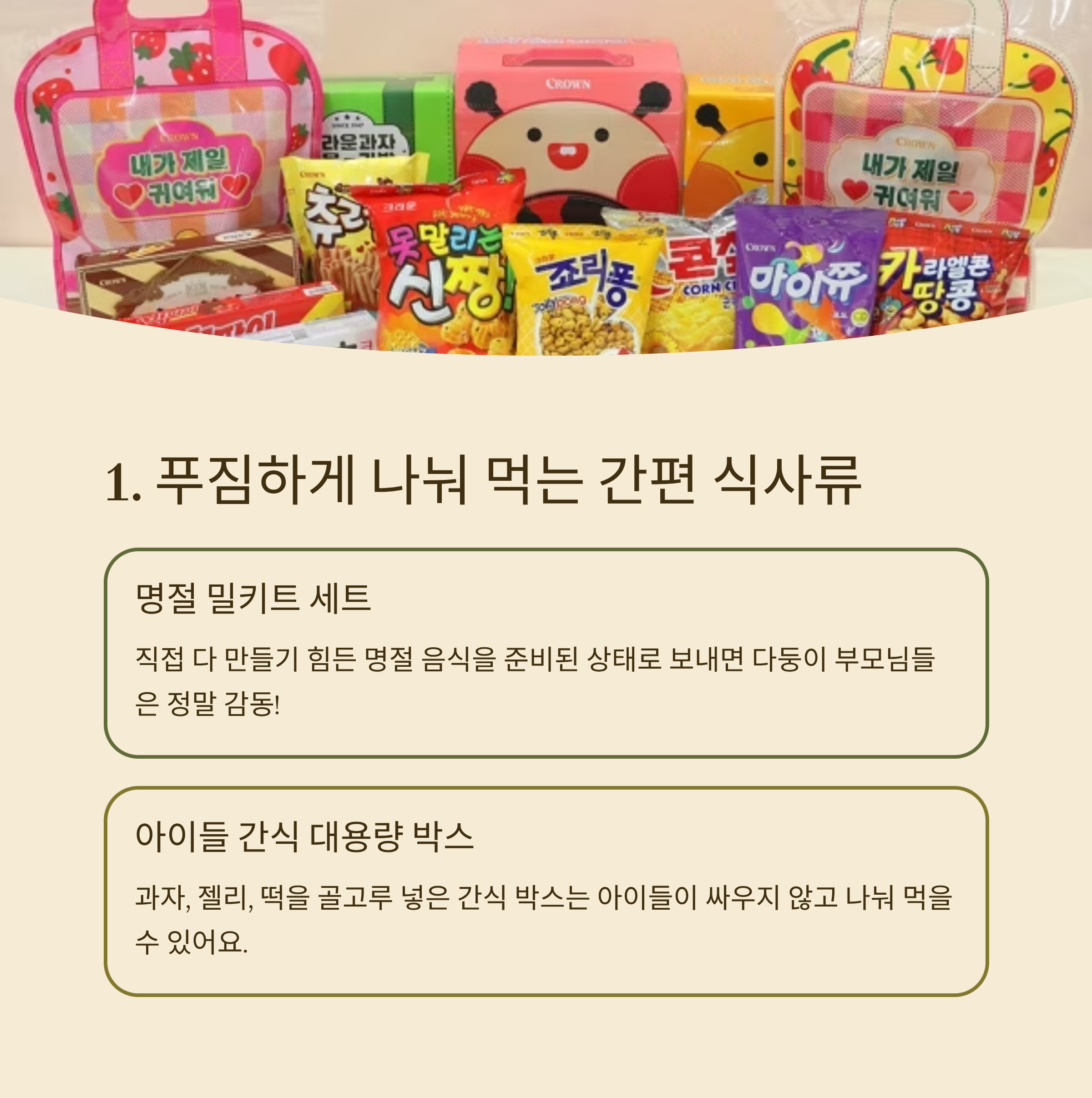 - ❌ 참치나 햄 세트: 보관하기도 부담스럽고 아이들은 안 먹어요.