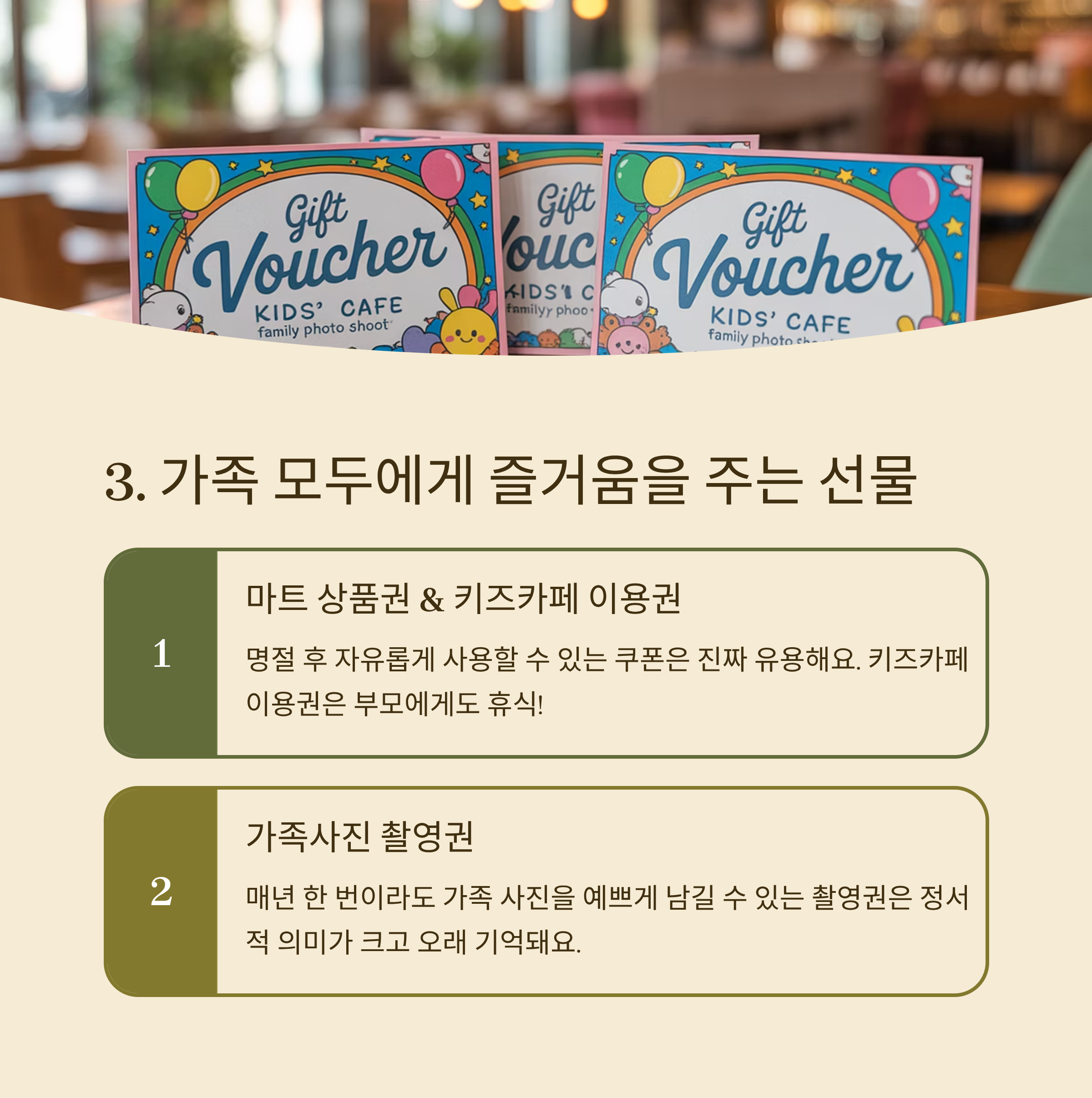 | 체험 | 키즈카페 이용권, 가족사진 촬영권 |