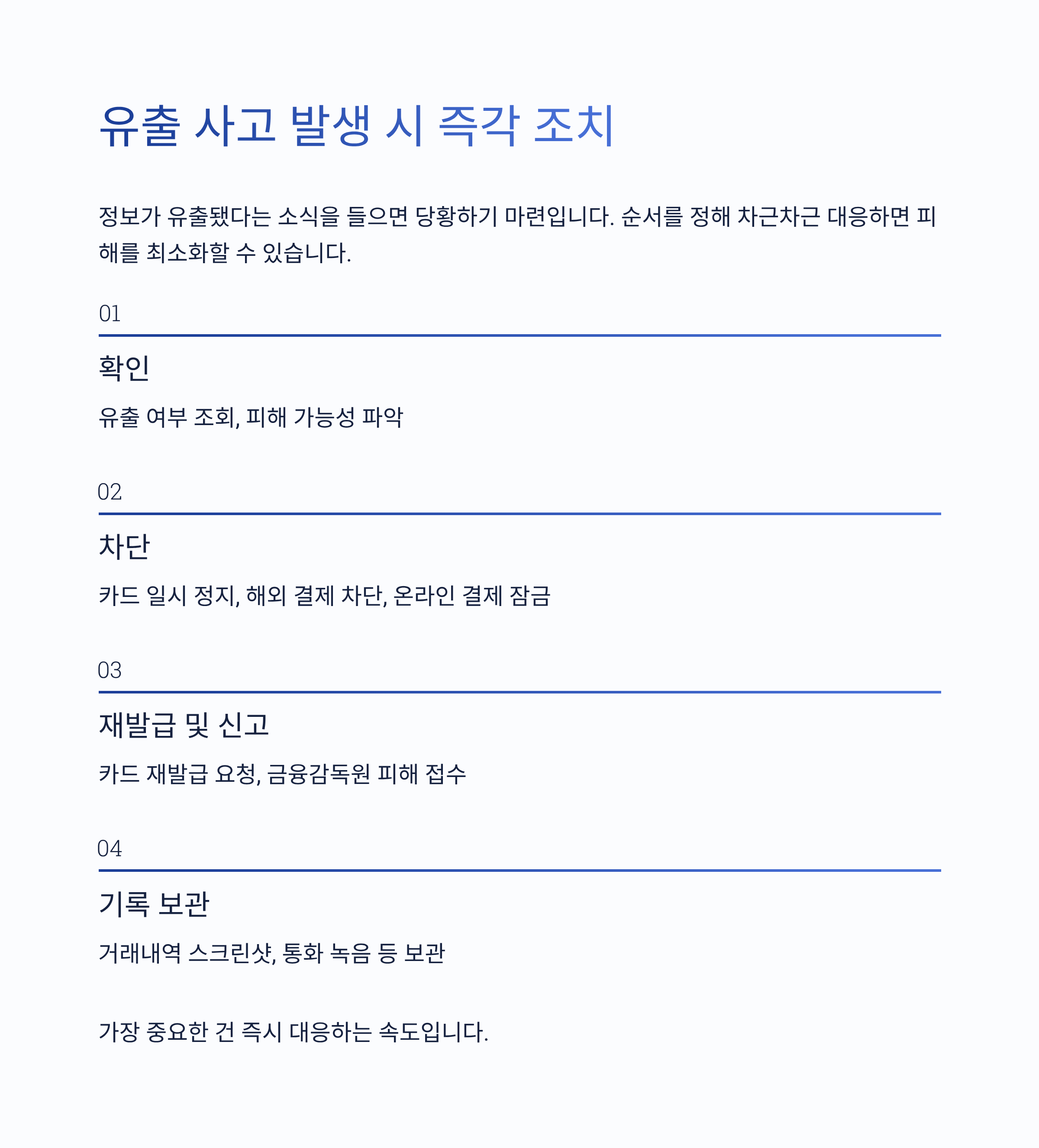 가장 중요한 건 즉시 대응하는 속도입니다. 유출이 의심되면 1분도 아까워요.