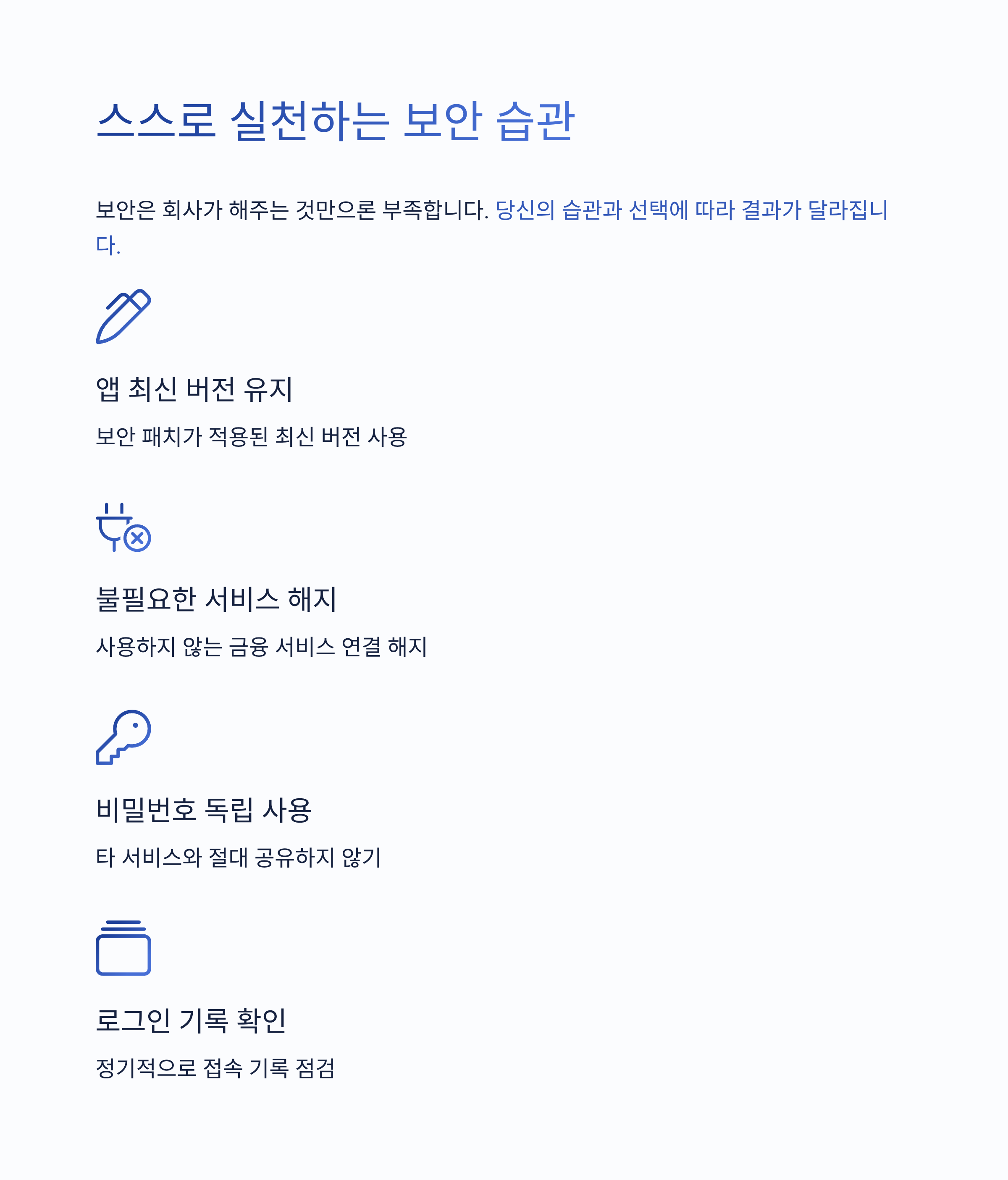 | 비밀번호 2단계 인증 | 앱 접속 시 생체 인증, 문자 인증 등 추가 확인 절차 적용 |