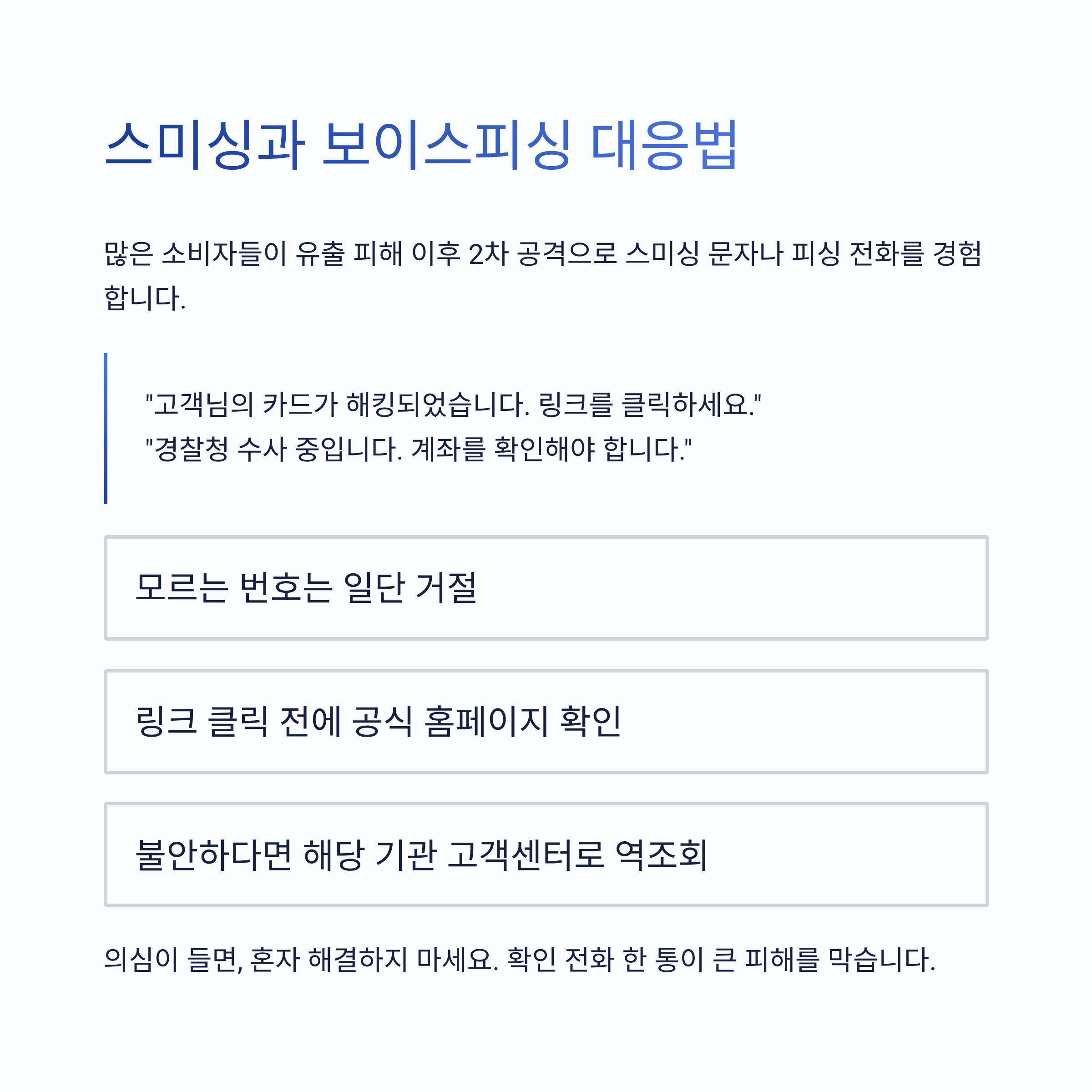 많은 소비자들이 유출 피해 이후 2차 공격으로 스미싱 문자나 피싱 전화를 경험합니다.