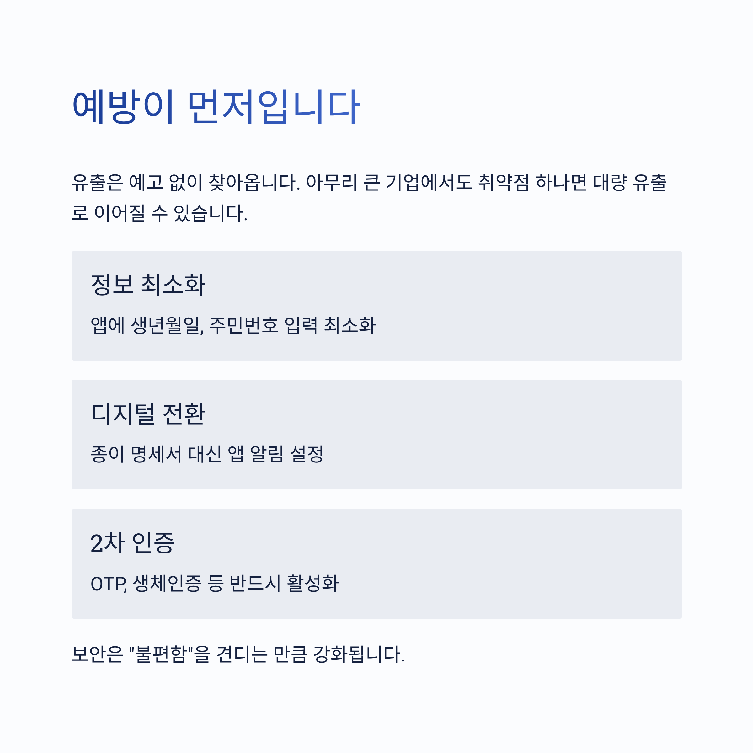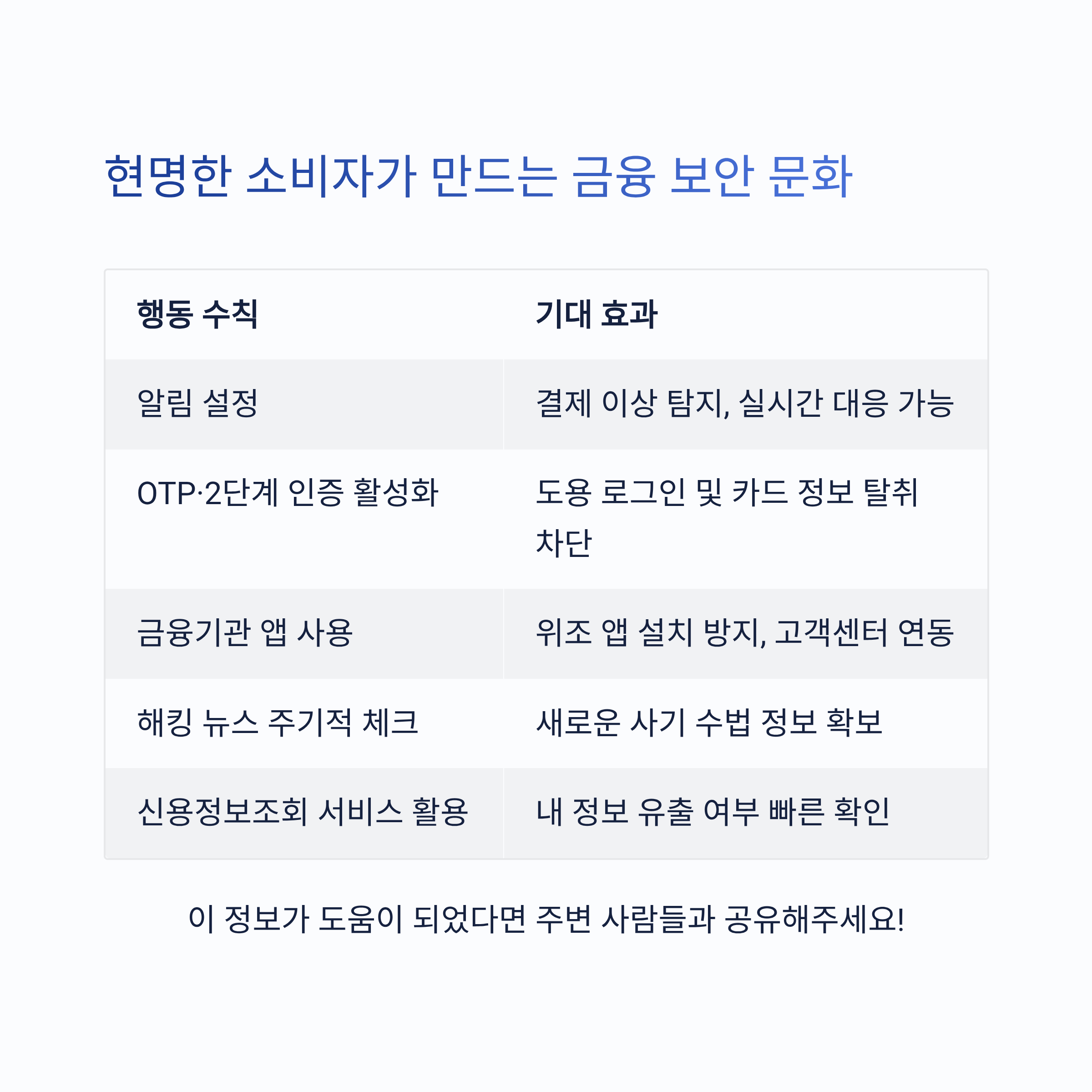| OTP·2단계 인증 활성화 | 도용 로그인 및 카드 정보 탈취 차단 가능 |