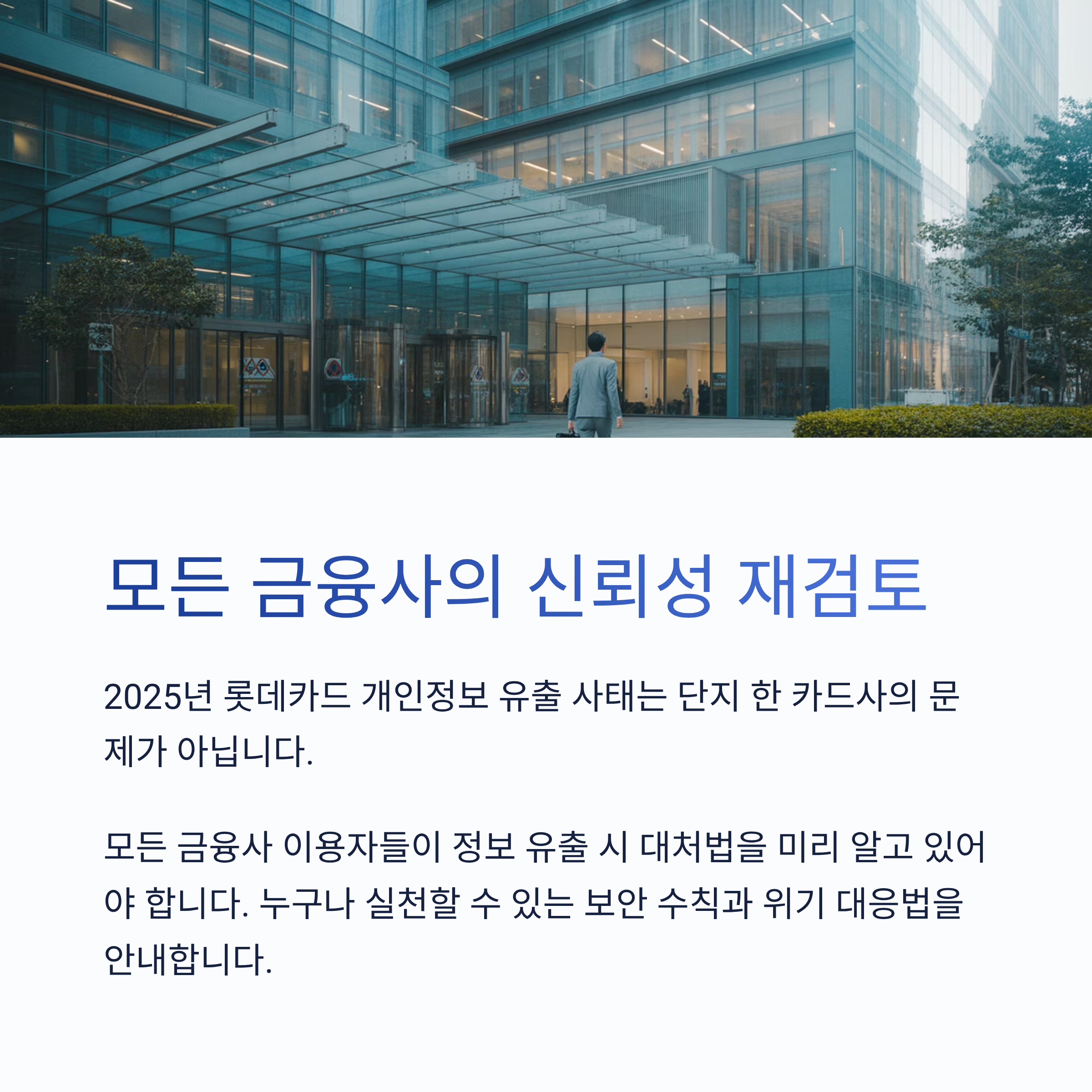 2025년 롯데카드의 개인정보 유출 사태는 단지 한 카드사의 문제가 아닙니다. 우리가 일상적으로 사용하는 모든 금융사의 정보 관리 체계에 대한 신뢰를 다시 돌아보게 만든 사건이죠. 이번 사고를 계기로 다른 카드사, 은행, 핀테크 서비스 이용자들 또한 나의 정보가 유출되었을 경우 어떻게 대처해야 할지 미리 알고 있어야 합니다. 지금부터 누구나 실천할 수 있는 보안 수칙과 위기 대응법을 안내해 드립니다.