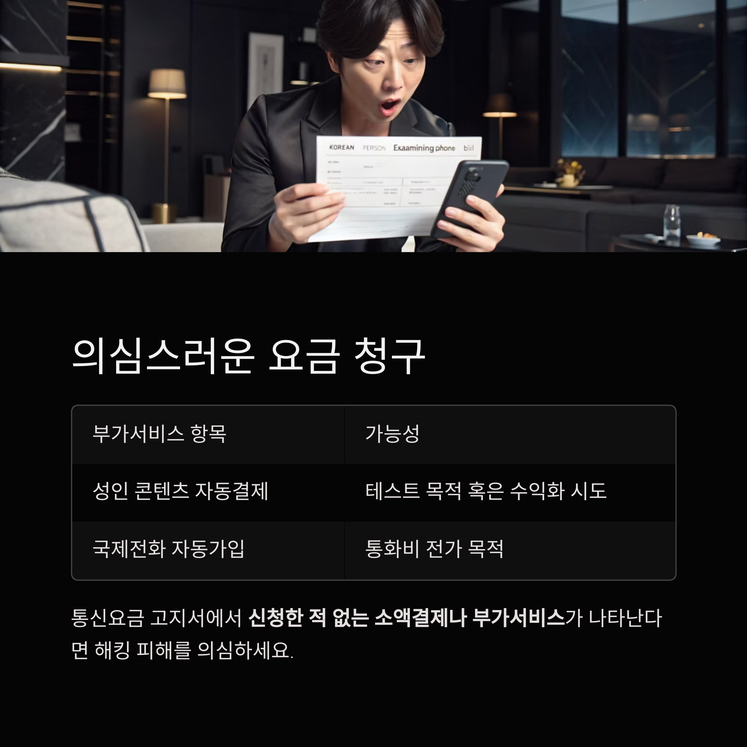 자신이 신청한 적 없는 소액결제나 부가서비스 항목이 나타난다면 해킹 피해를 의심해보세요.