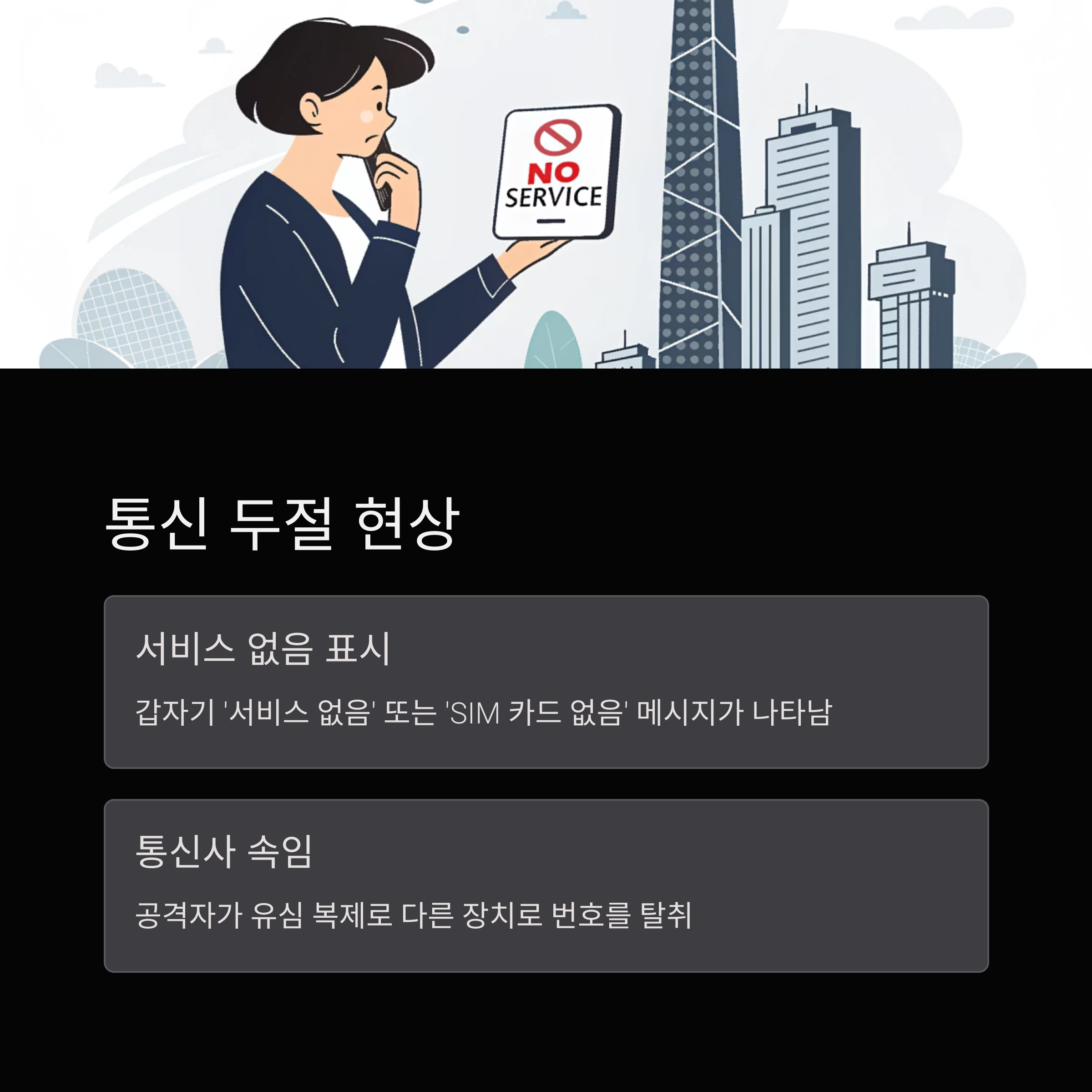 '서비스 없음(No Service)'이나 'SIM 카드 없음'으로 표시된다면 유심 해킹의 가능성을 의심해야 합니다.
