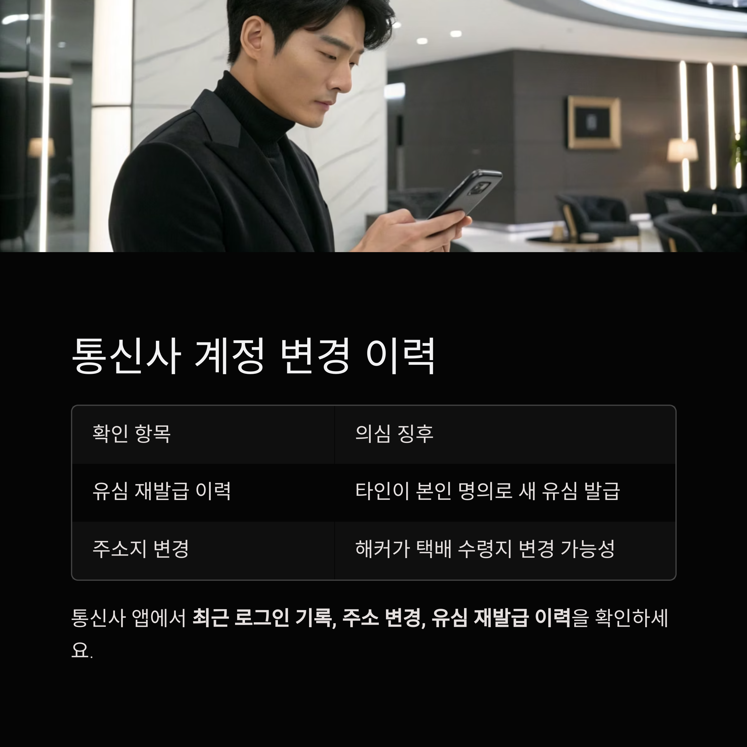 최근 로그인 기록, 주소 변경, 유심 재발급 이력이 있다면 반드시 확인해야 합니다.