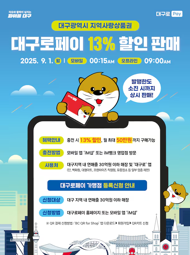 2025년 9월부터 대구로페이의 할인율이 기존 7%에서 13%로 인상되며 시민들의 생활비 절약 효과가 더욱 커졌습니다. 충전 한도도 100만 원까지 확대되어 추석 장보기와 일상 지출에 실질적인 도움이 되고 있습니다. 특히 50만 원 충전 시 65,000원의 할인 혜택을 누릴 수 있어 가계 부담을 줄이기에 딱 좋은 시기입니다. 이번 글에서는 대구로페이 13% 할인 효과와 충전 방법, 사용처, 카드 발급 방법까지 모두 정리해 드리겠습니다.