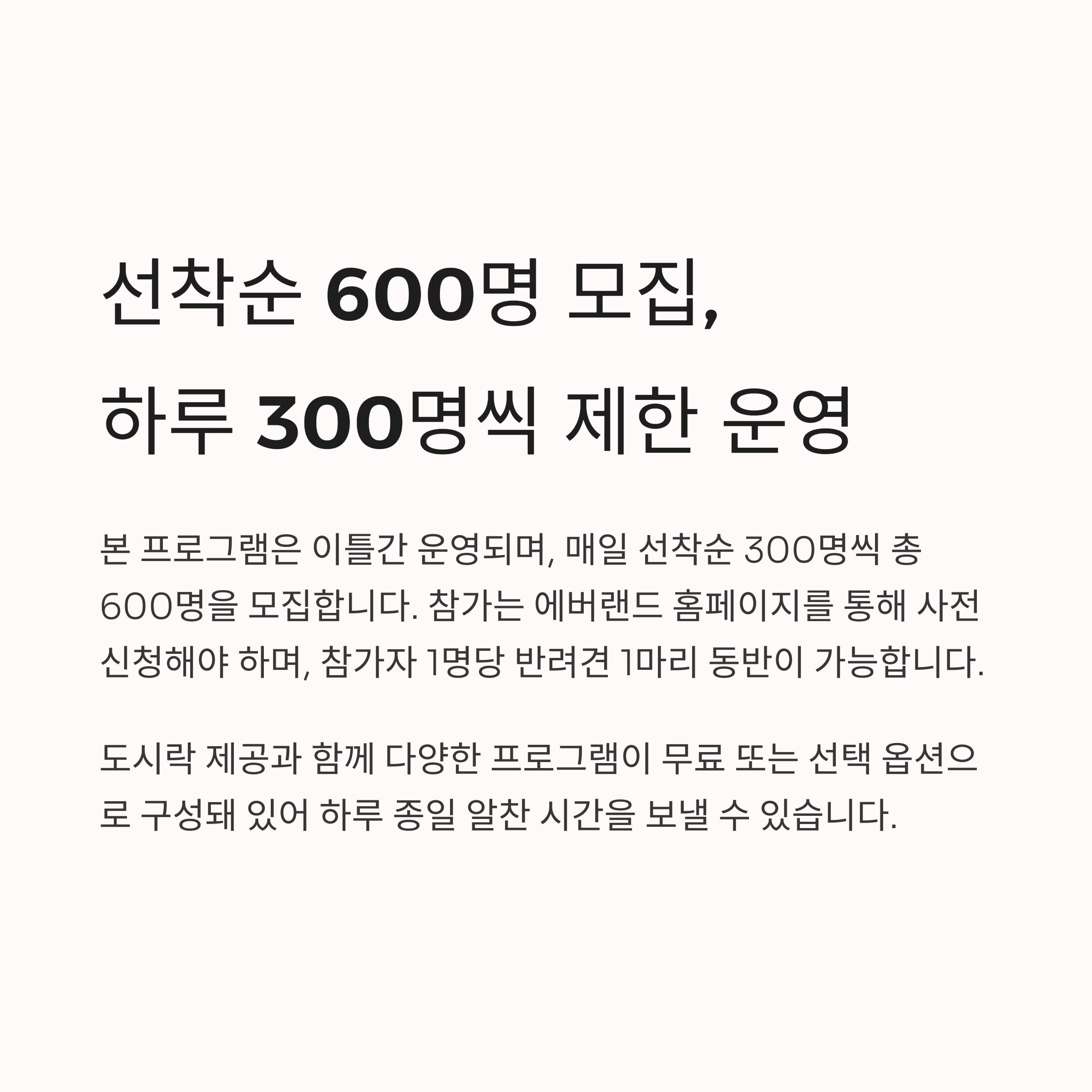 본 프로그램은 이틀간 운영되며, 매일 선착순 300명씩 총 600명을 모집합니다.