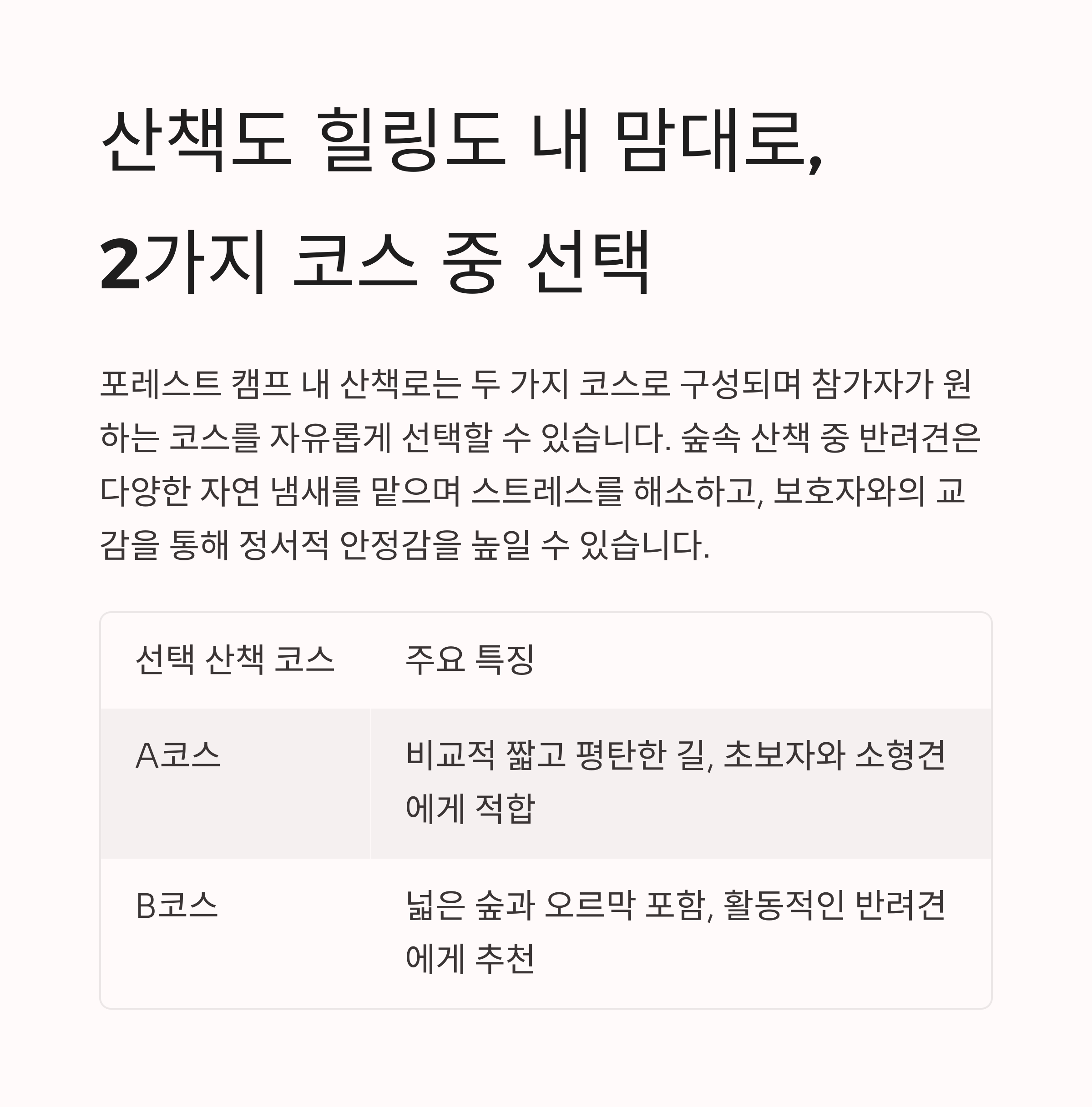 | B코스 | 넓은 숲과 오르막 포함, 활동적인 반려견에게 추천 |