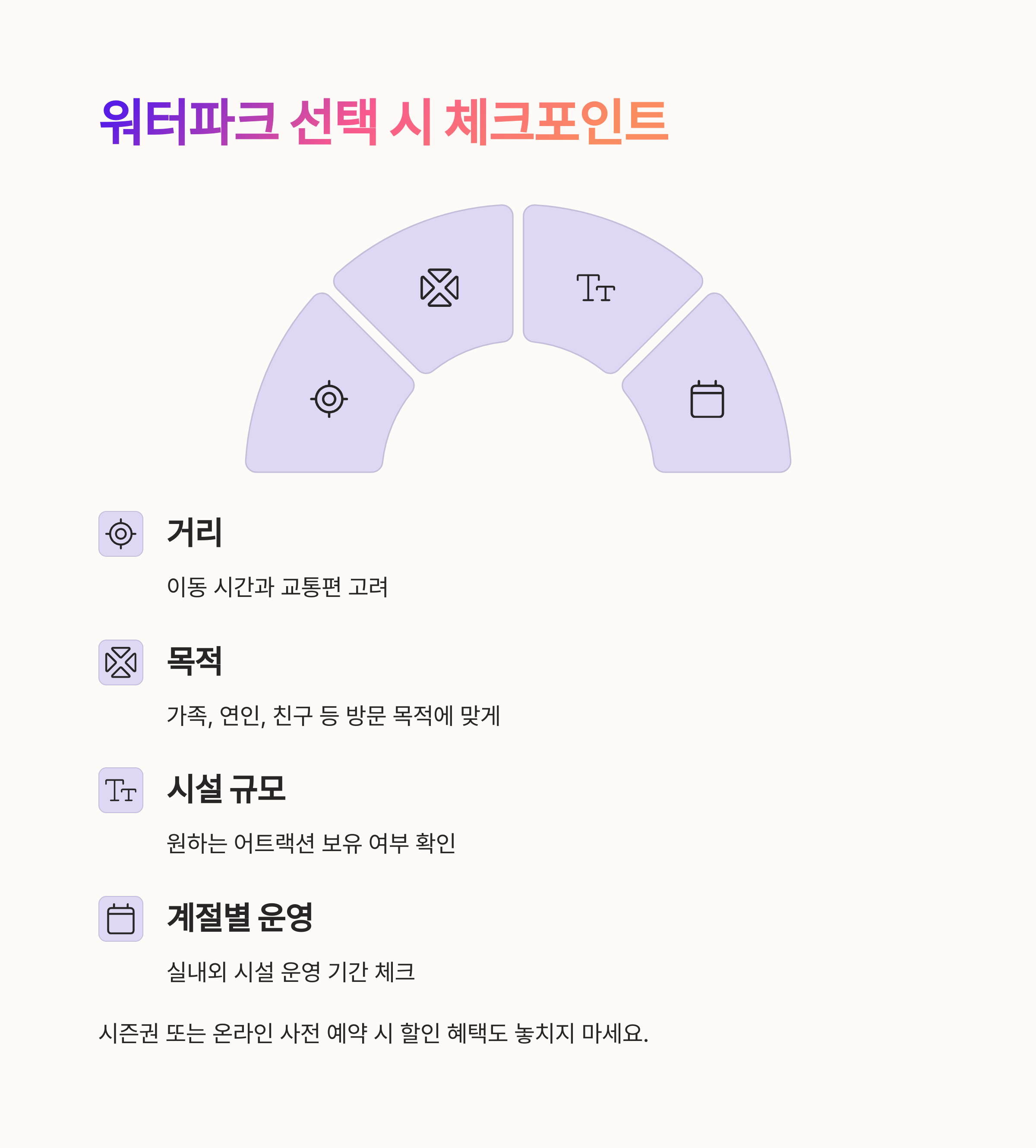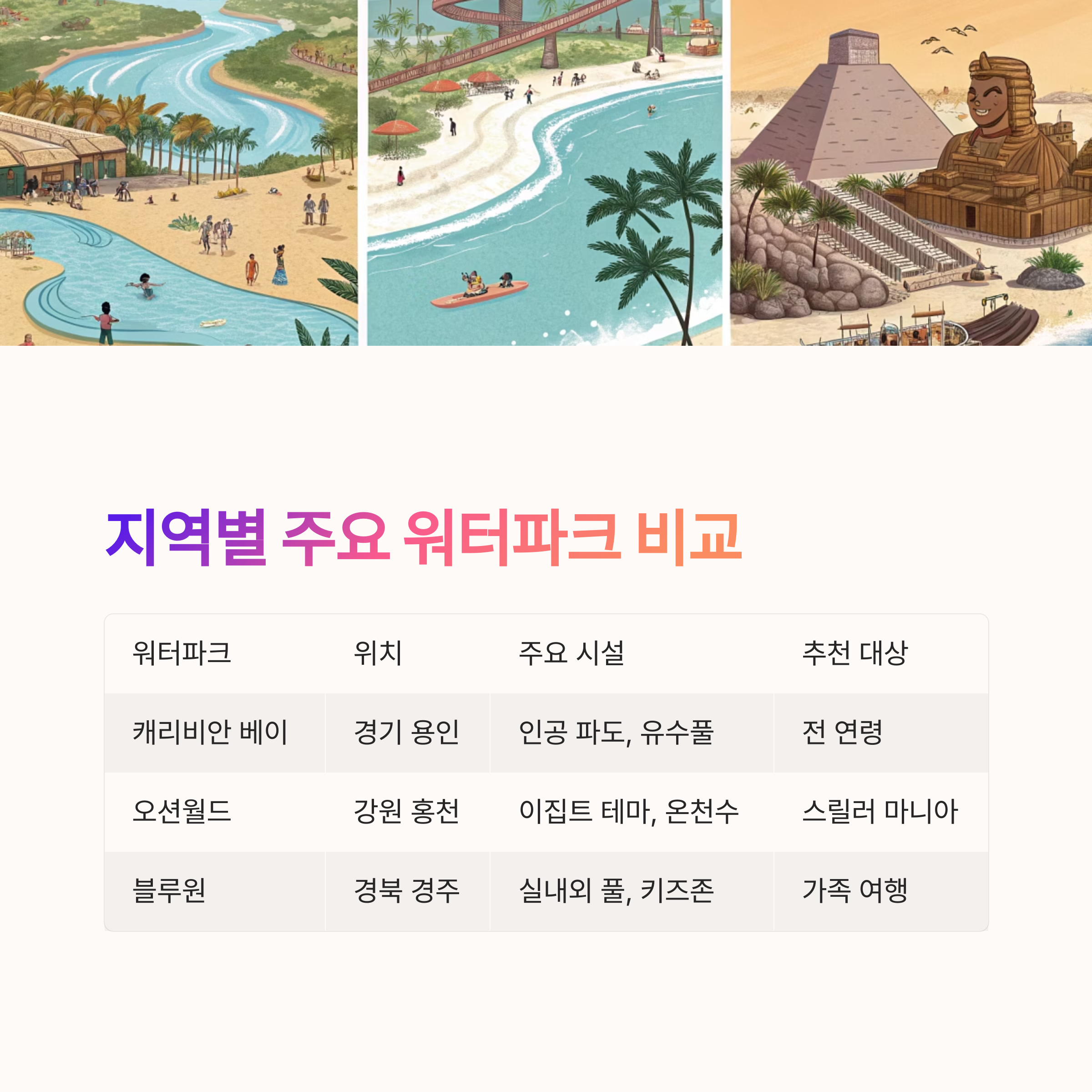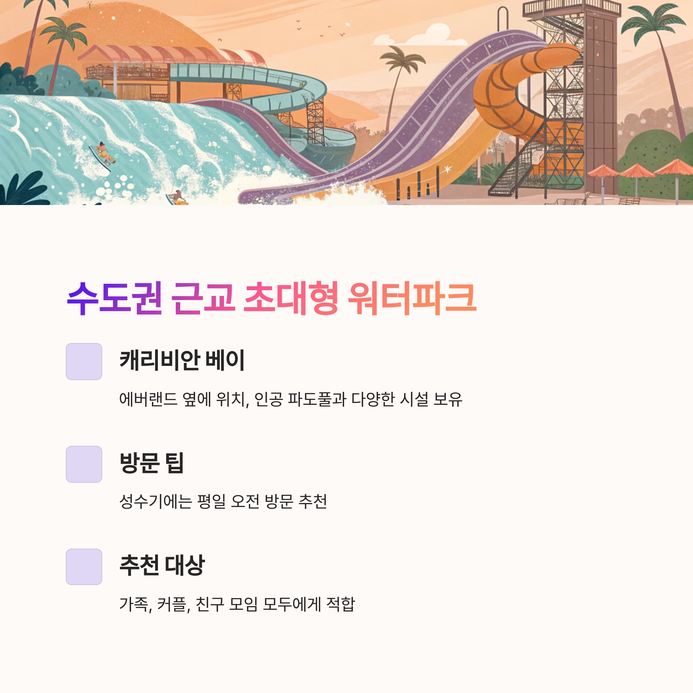 워터파크를 선택할 때는 거리, 목적, 시설 규모, 계절별 운영 여부 등을 체크하는 것이 중요합니다.