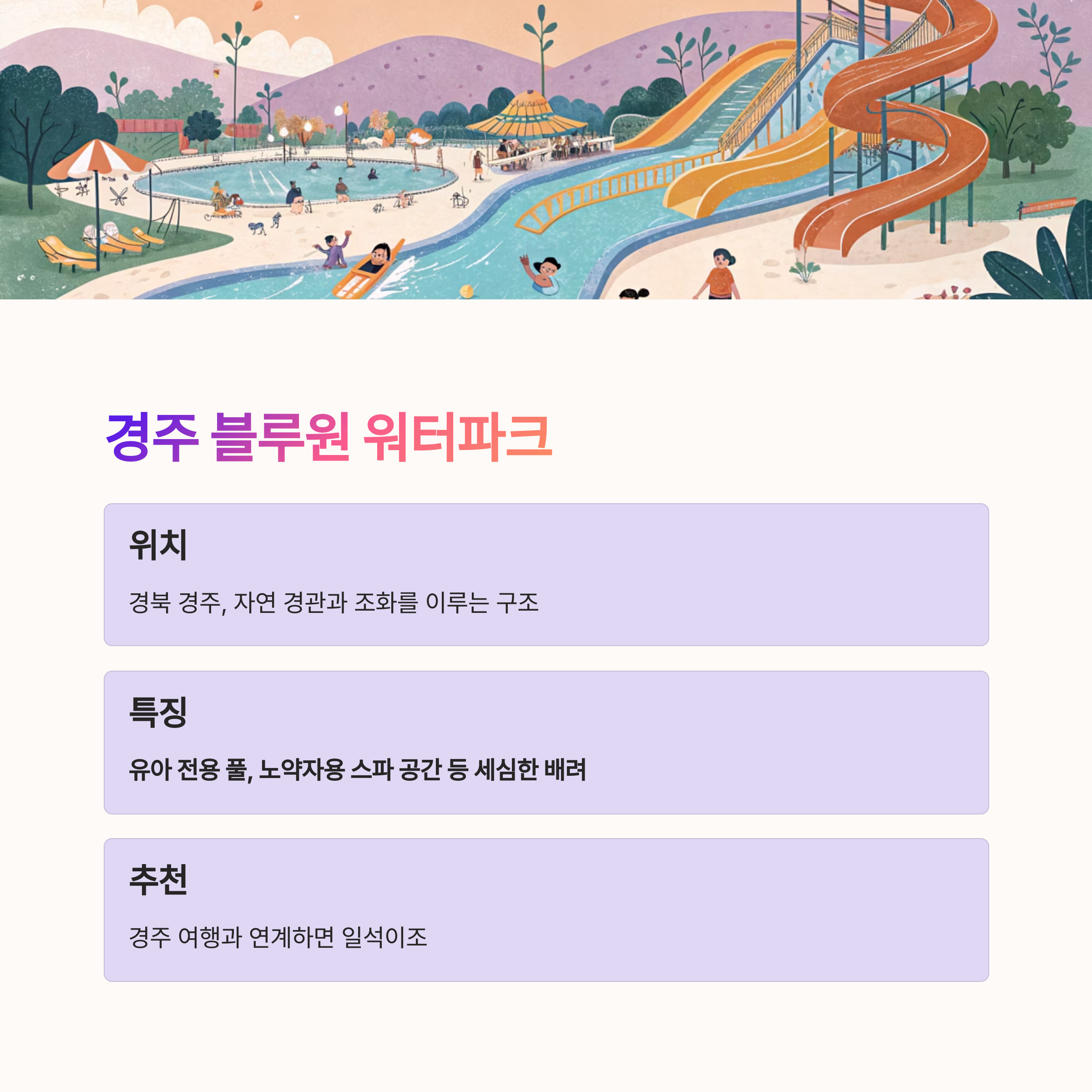 | 블루원 워터파크 | 경북 경주 | 실내외 풀, 키즈존, 스파 | 가족 여행 |