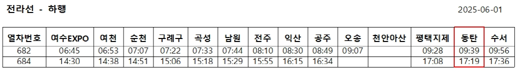 동탄역 출발 하행(호남선·전라선) 주요 시간표