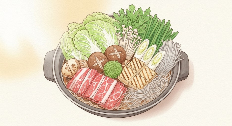 스키야키는 얇게 썬 소고기와 다양한 채소, 버섯, 두부 등을 냄비에 자작하게 끓여 먹는 일본식 전골 요리예요.