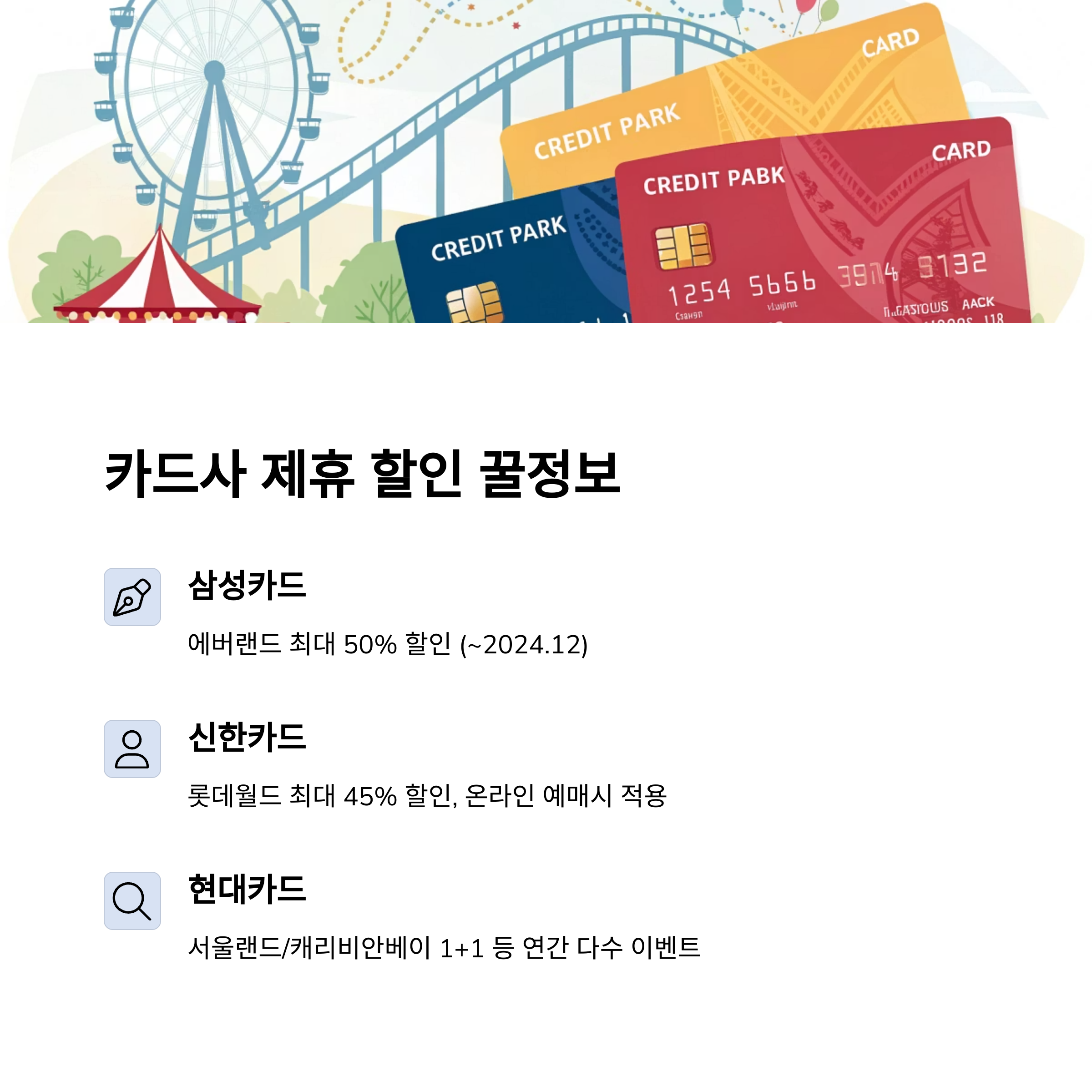 - 삼성카드: 에버랜드, 롯데월드, 서울랜드 상시 할인