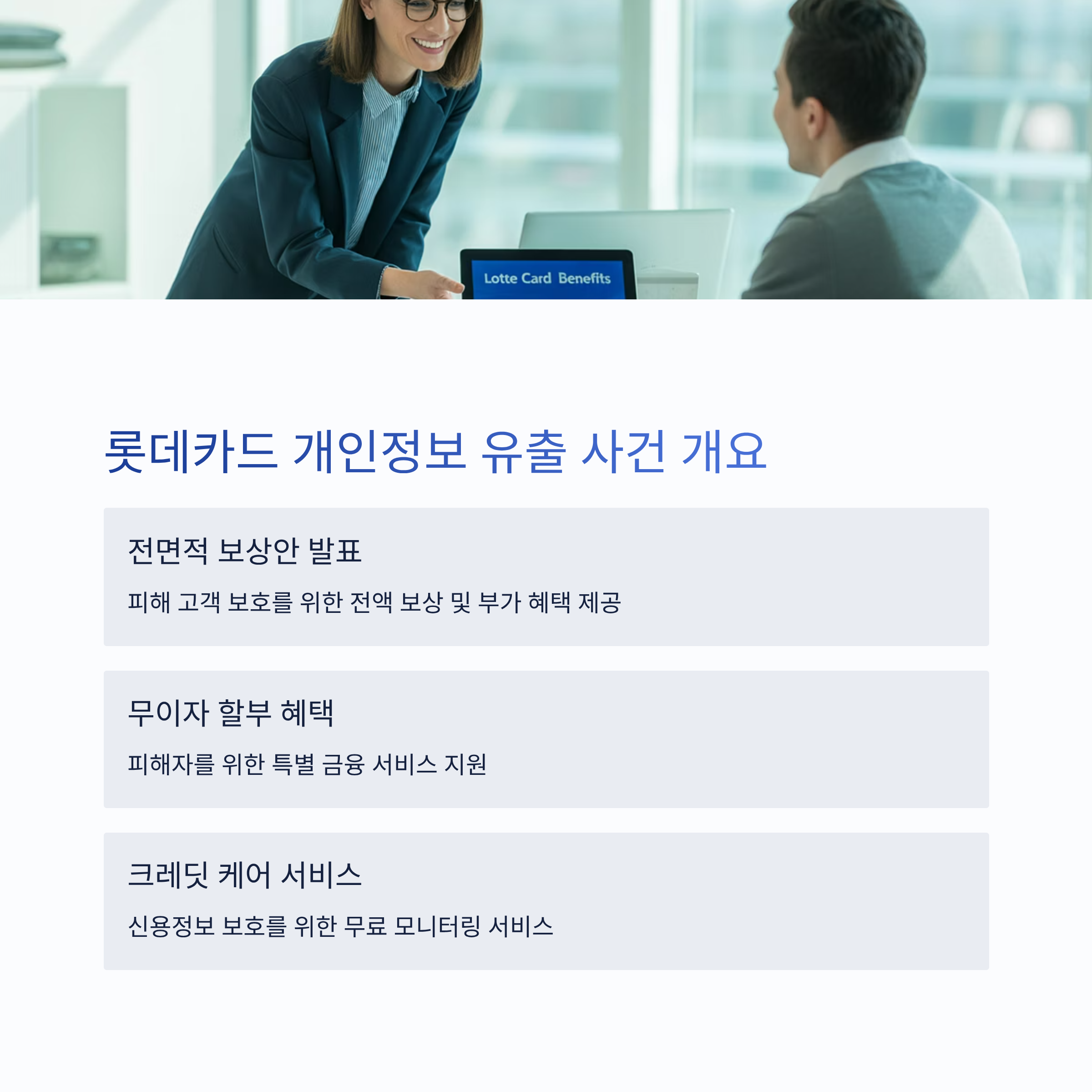 최근 발생한 롯데카드 개인정보 유출 사건으로 인해 많은 소비자들이 불안감을 느끼고 있습니다. 이에 롯데카드는 피해 고객을 보호하기 위한 전면적인 보상안을 발표했으며, 전액 보상과 함께 무이자 할부, 크레딧 케어 서비스 등의 부가 혜택도 제공하겠다고 밝혔습니다. 이번 글에서는 구체적인 보상 절차와 피해자들이 꼭 알아야 할 유의사항을 정리해 드립니다.