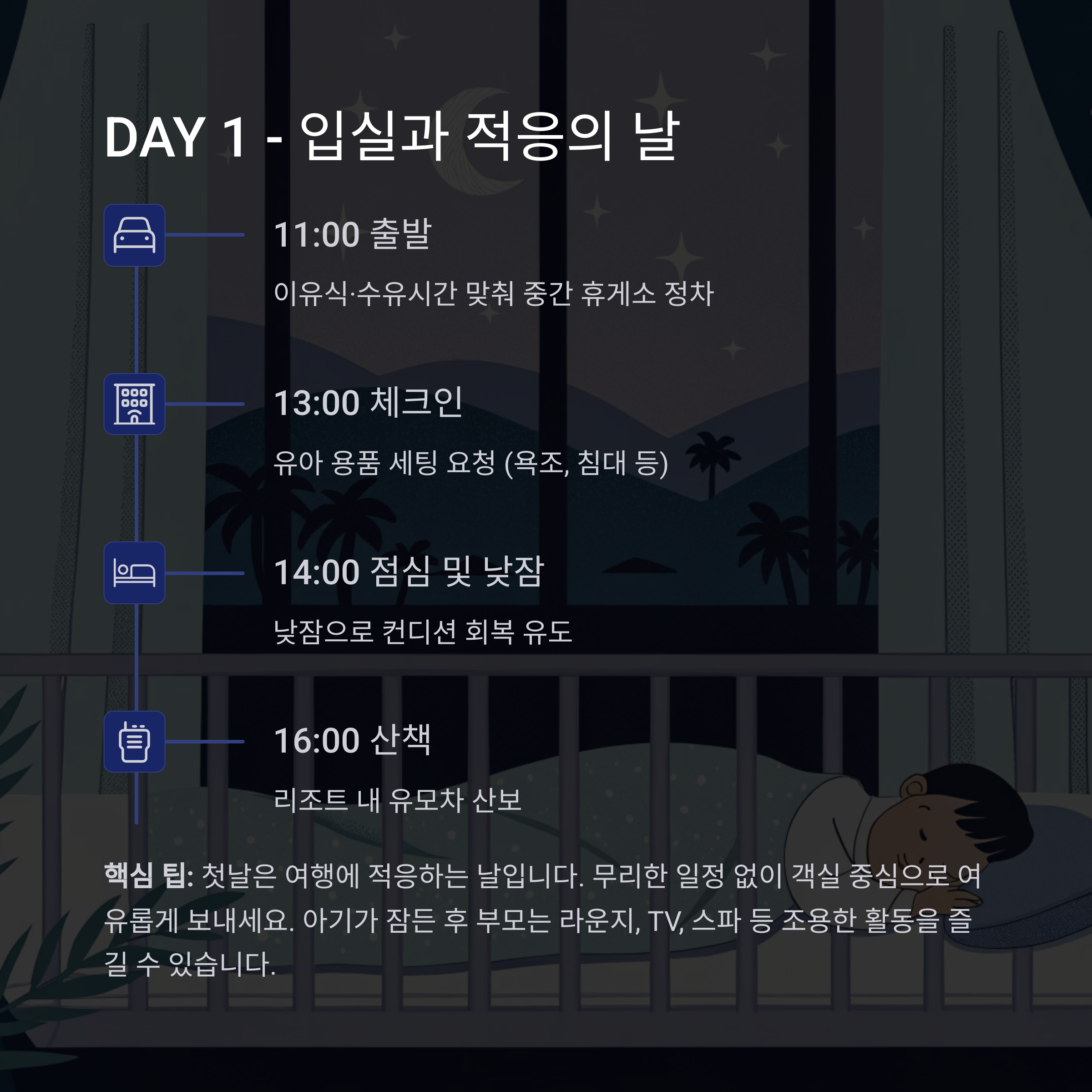 | 1일차 | 이동 최소화, 객실 적응 중심 | 아기 재운 후 자유 시간 확보 |