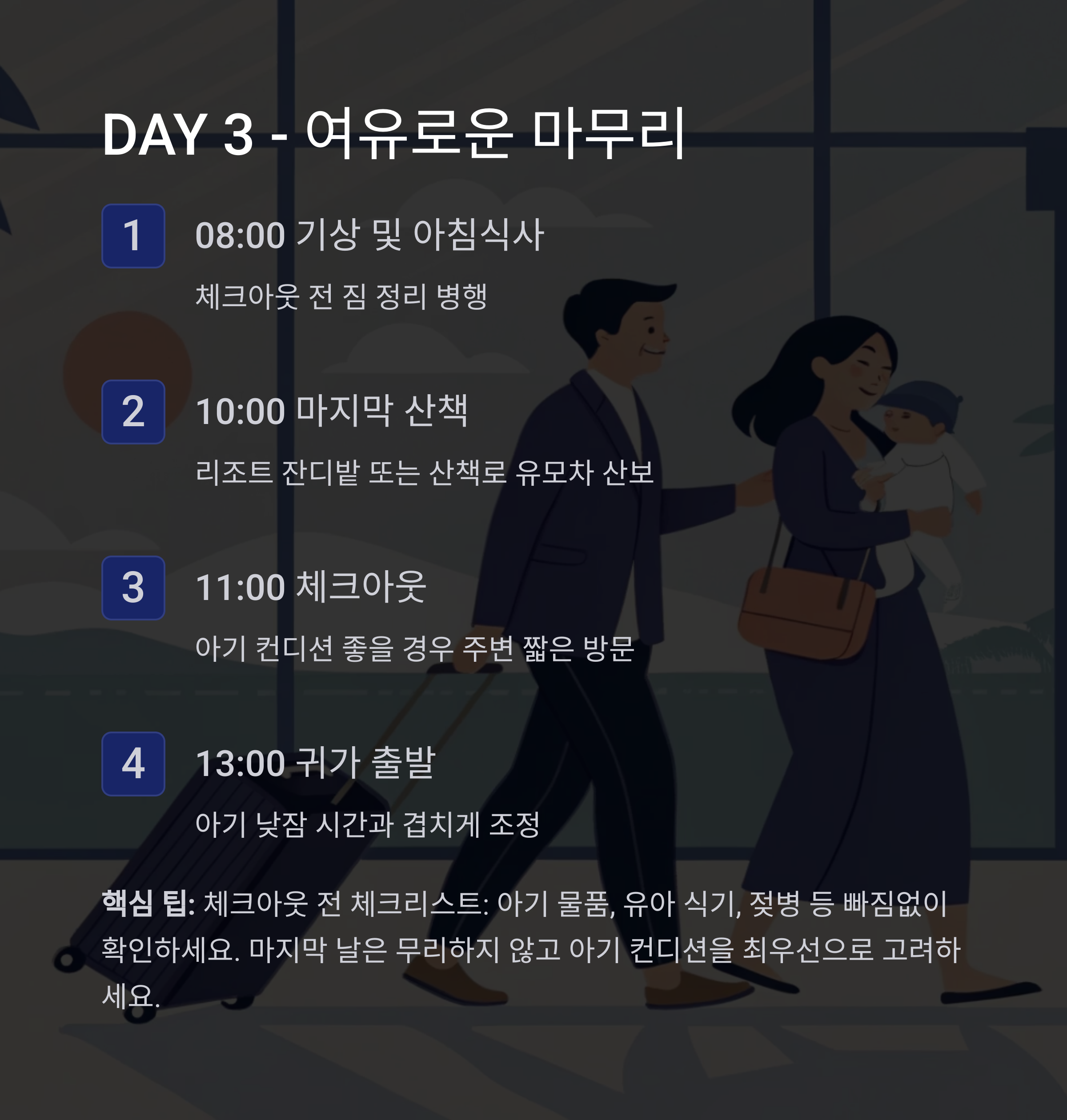 | 11:00 | 체크아웃 및 주변 카페/관광지 짧은 방문 | 아기 컨디션 좋을 경우만 계획 |