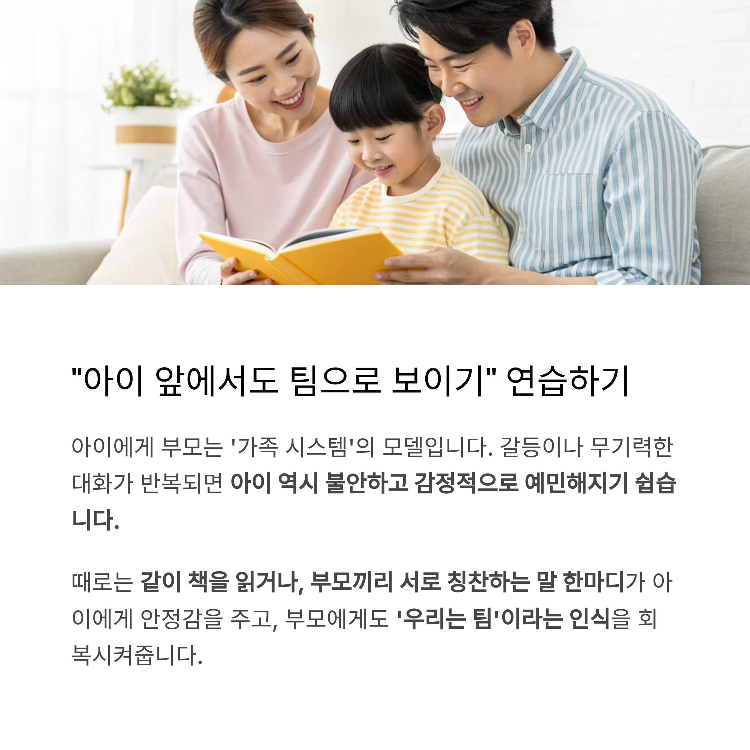 아이에게 안정감을 주고, 부모에게도 ‘우리는 팀’이라는 인식을 회복시켜줍니다.