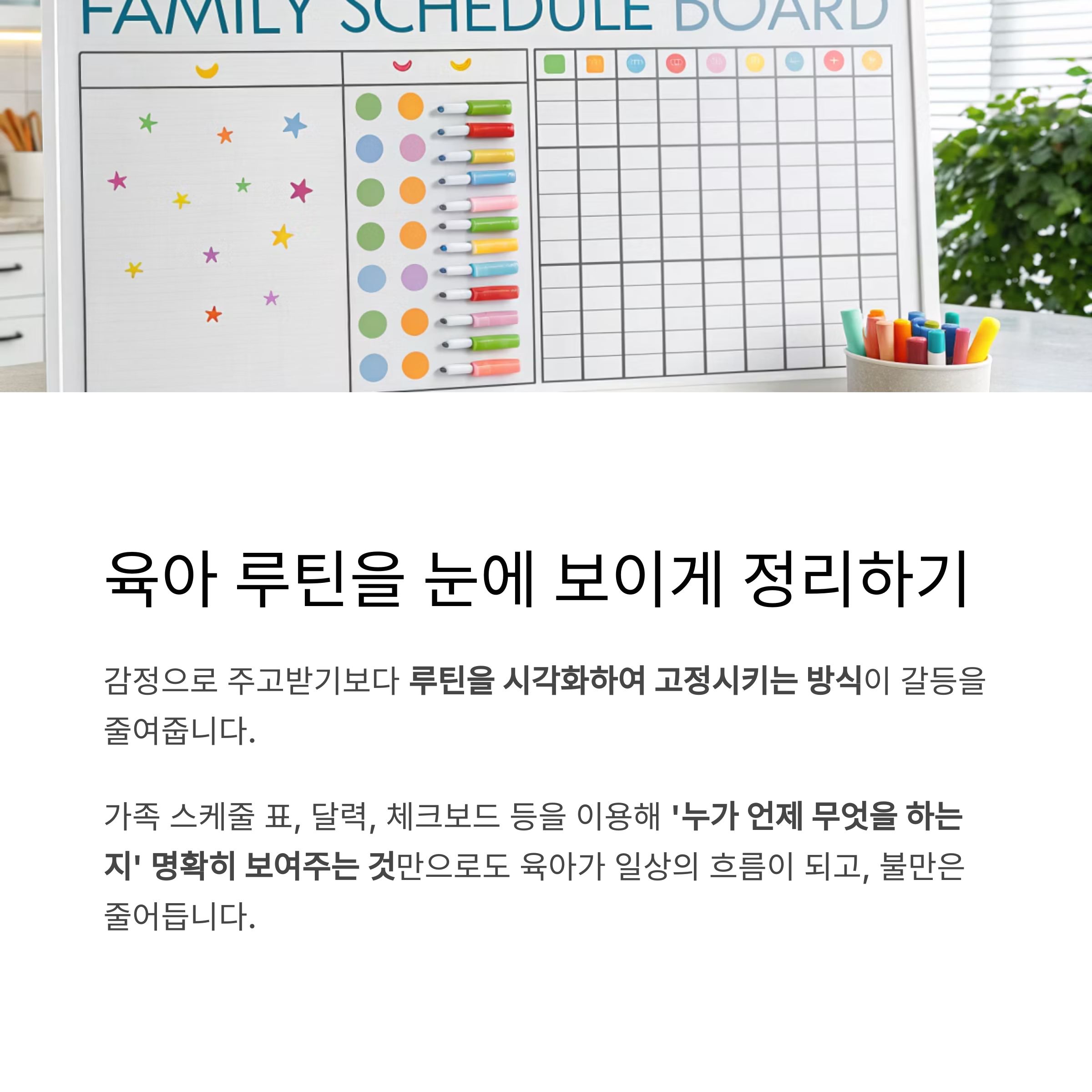 루틴을 시각화하여 고정시키는 방식이 갈등을 줄여줍니다.
