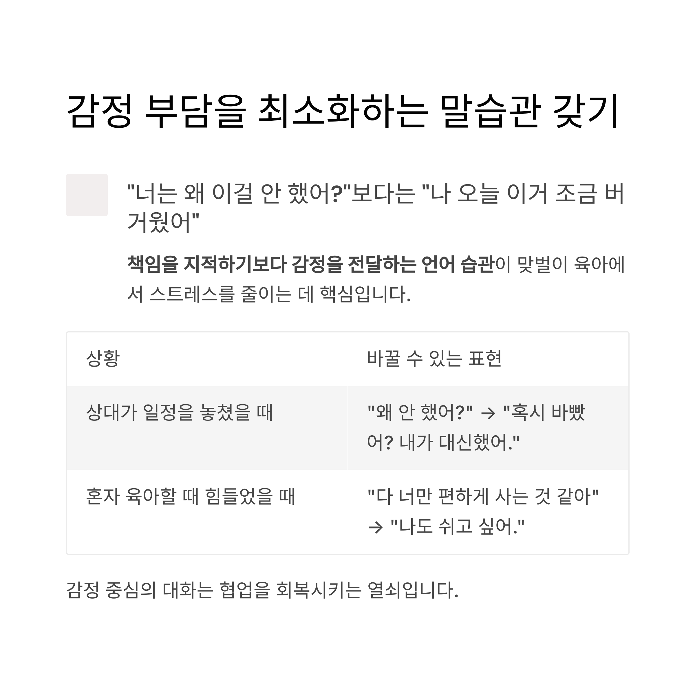 | 혼자 육아할 때 힘들었을 때 | “다 너만 편하게 사는 것 같아” → “나도 쉬고 싶어.” |