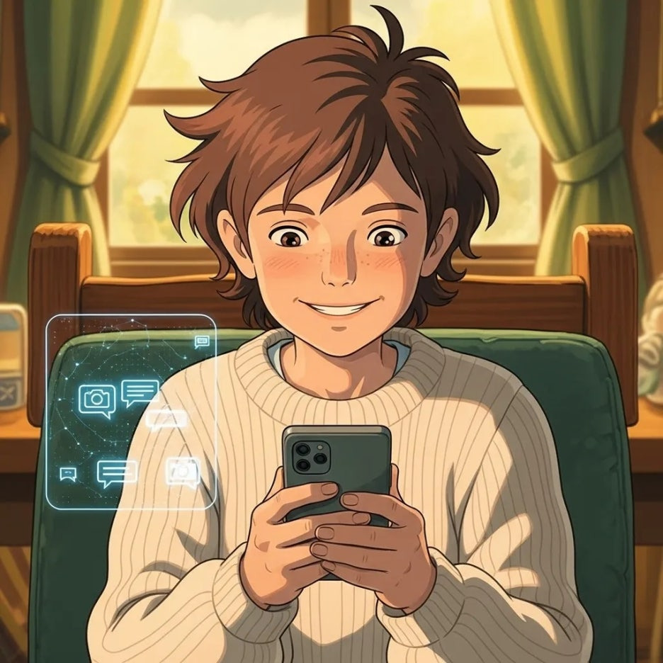 AI 활용 스마트폰을 보며 미소 짓는 사람과 디지털 카드