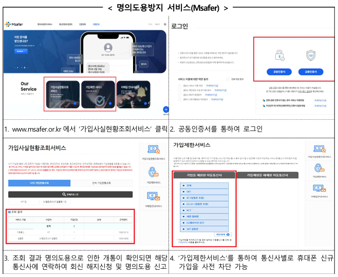 | 엠세이퍼 (Msafer) | 내 명의로 가입된 통신 서비스(휴대폰, 인터넷 등) 현황 조회, 가입 제한 서비스 신청 | 웹사이트(www.msafer.or.kr) 접속, 공동인증서(구 공인인증서) 본인인증 후 이용 |