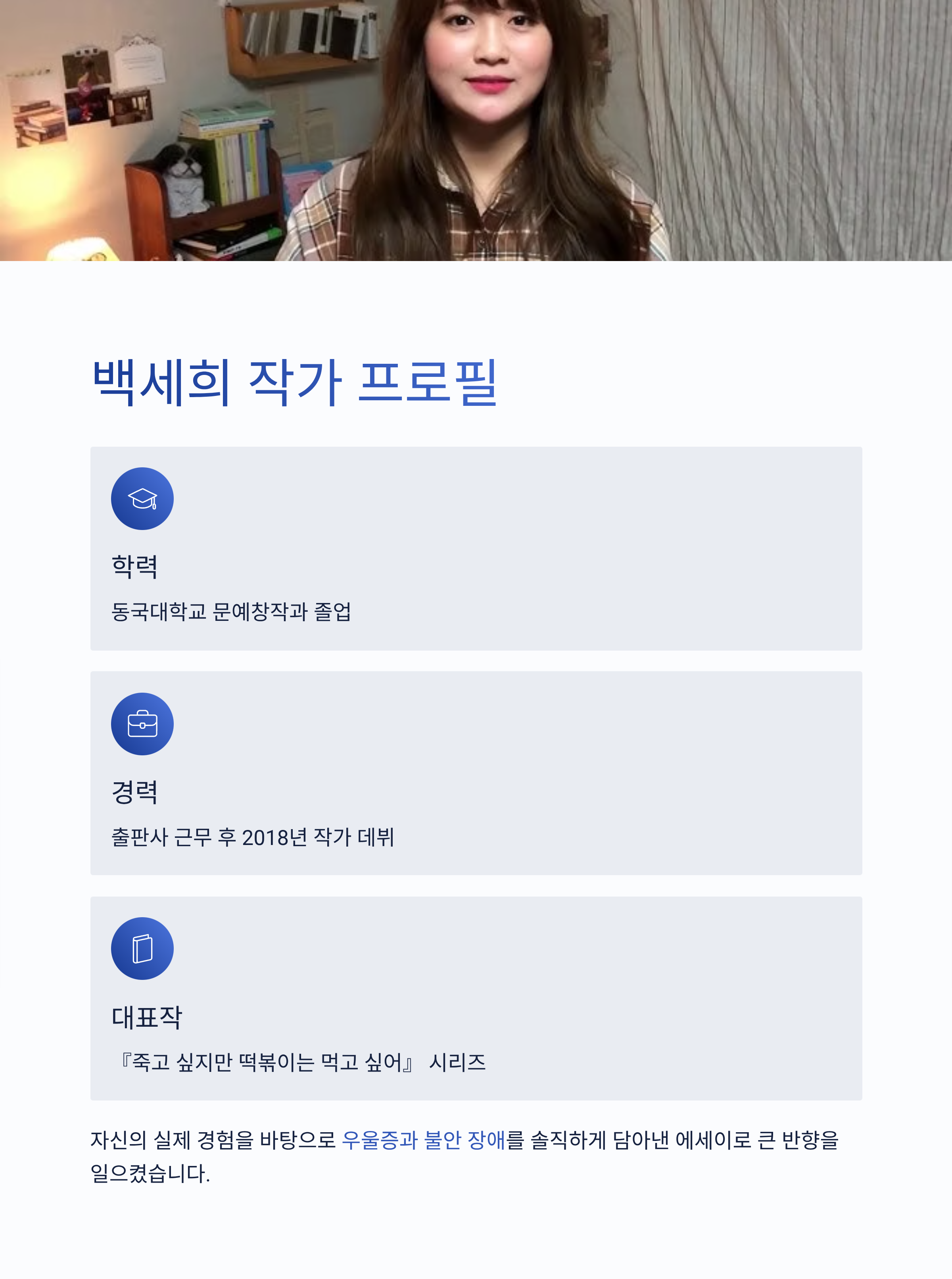 백세희 작가는 자신의 실제 경험을 바탕으로 우울증과 불안 장애를 솔직하게 담아낸 에세이로 큰 반향을 일으켰습니다.