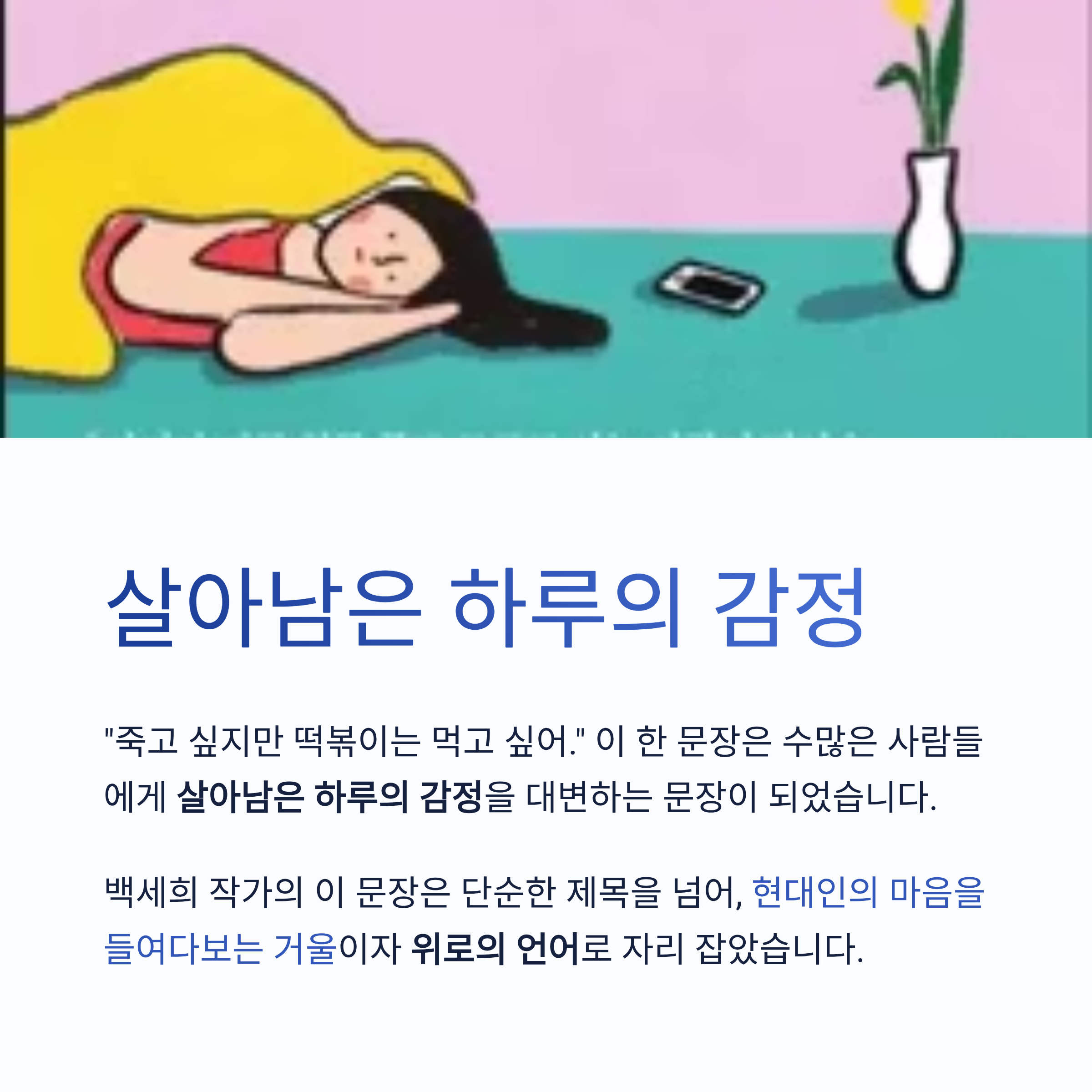 백세희 작가의 글은 완벽한 해결책이 아니라, **‘같이 버텨주는 문장’**으로 존재합니다.