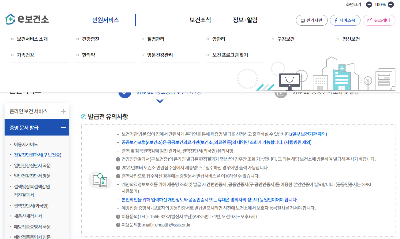 보건복지부와 한국사회보장정보원이 운영하는 온라인민원 서비스,건강진단결과서(구 보건증) 등 제증명 발급, 의료비지원 등 안내