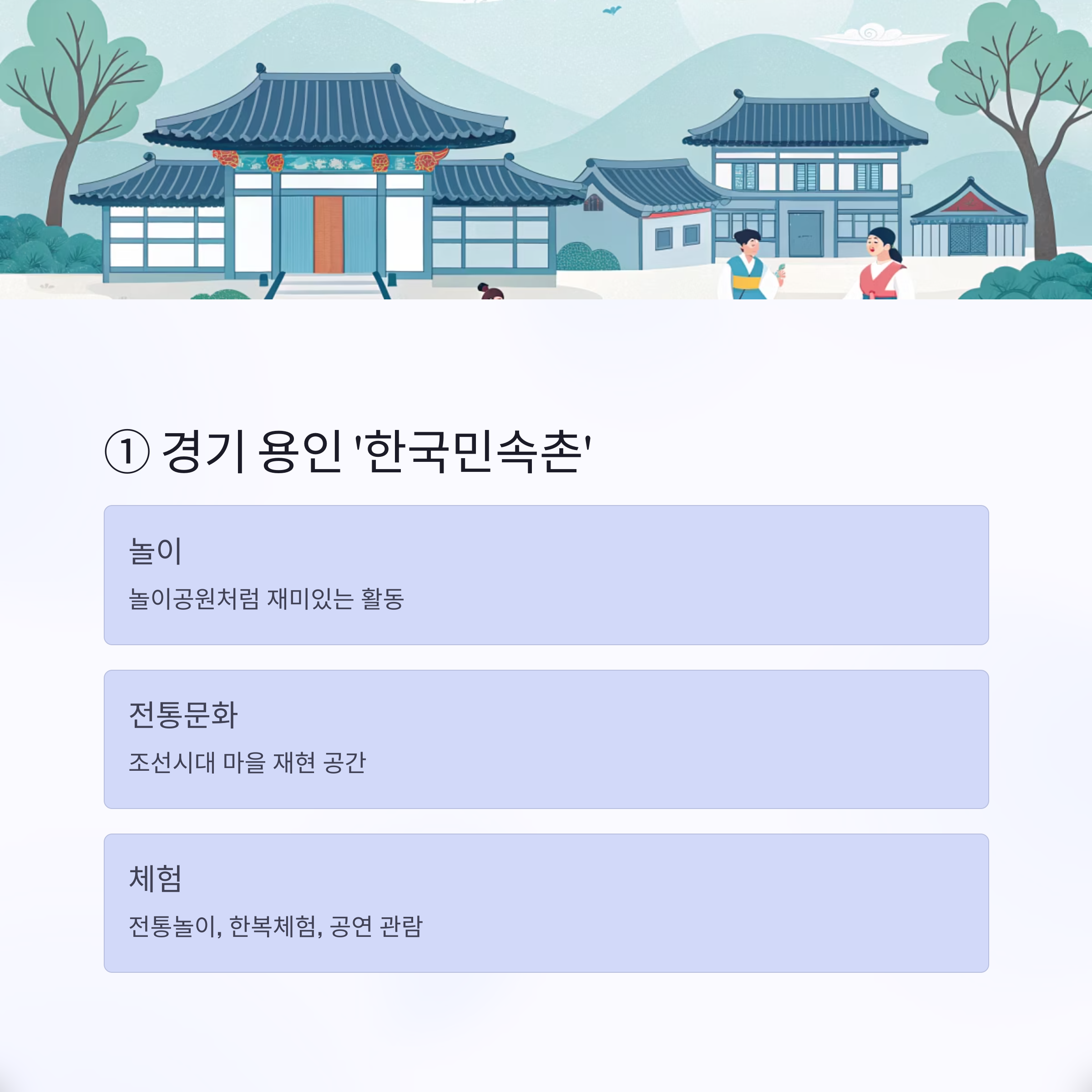 | 1위 | 용인 | 한국민속촌 | 전통+놀이 |