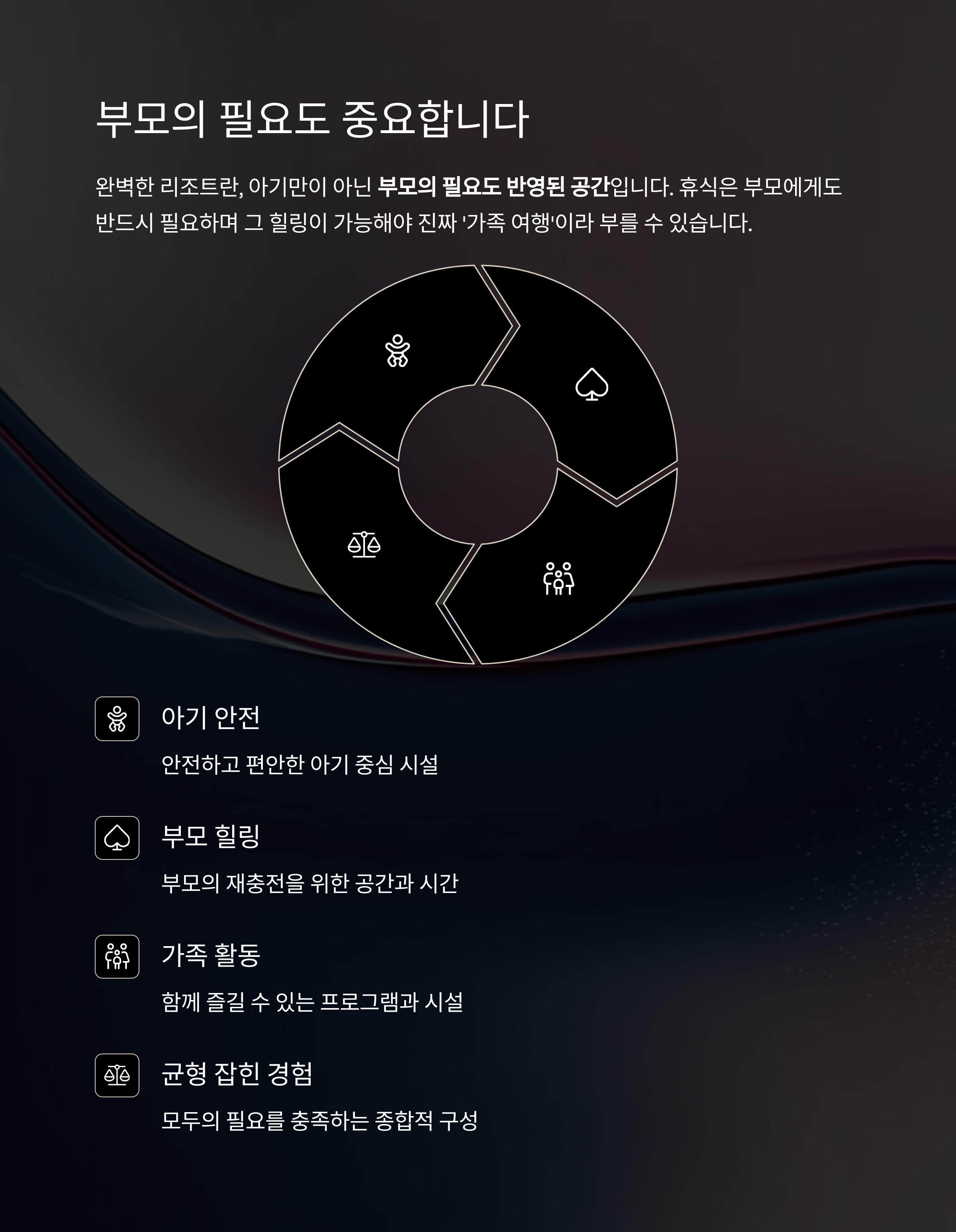아기 중심의 편의시설과 부모를 위한 힐링 공간이 균형 잡힌 곳이 진정한 가족 리조트입니다