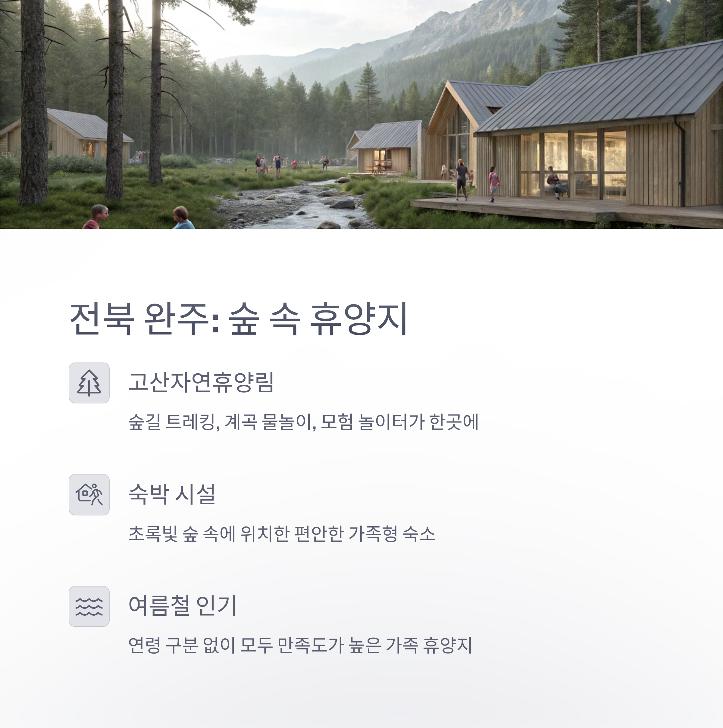 | 완주 | 고산휴양림 | 모험놀이터, 계곡 | 숙소+자연 |
